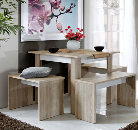 Elegantný jedálenský set so stolom a tromi lavicami. Vyrobený je z laminovanej DTD vo farebnej kombinácii dreva dub sonoma a bielej. Je vhodný na zariadenie menších jedální.