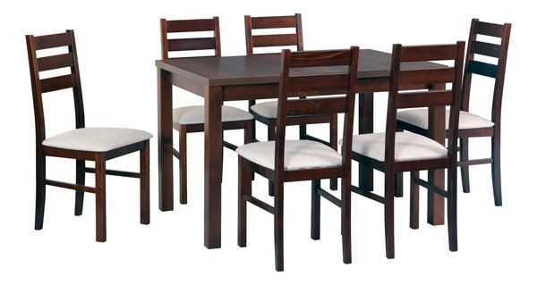 Moderný jedálenský set všestranného dizajnu, ktorý sa hodí do akejkoľvek jedálne a domácnosti. Set tvorí rozkladací jedálenský stôl a šesť jedálenských stoličiek. Set je menší a dobre zapasuje do menších jedální, či kuchýň. Jedálenský stôl je možné rozložiť, čím získate priestor pre šesť ľudí. Stoličky majú drevené operadlá a čalúnenú sedaciu časť.