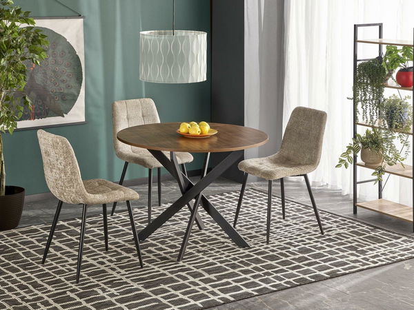 ZobraziťOkrúhly stôl Edgaro vnesie do vášho interiéru eleganciu a štýl. Jeho stolová doska vyrobená z kvalitnej laminovanej MDF dosky v krásnej farbe orecha dodá vášmu obytnému priestoru jedinečný šarm a teplo. Nohy stola v modernej čiernej farbe sú vyrobené z odolného kovu, ktorý zaručuje odolnosť a stabilitu nábytku. Okrem estetického vzhľadu je tento stolík aj funkčný. Jeho okrúhla forma podporuje voľnú konverzáciu a integráciu pri spoločných stretnutiach či stolovaní. Je to ideálne miesto na vytvorenie nezabudnuteľných chvíľ s rodinou a priateľmi.