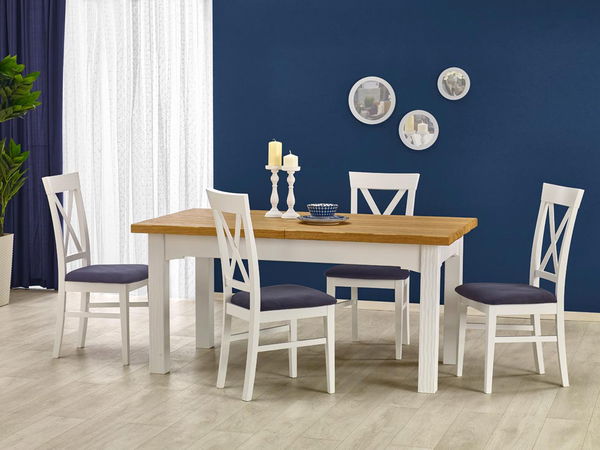 Jedálenský stôl Eles je ideálny pre rodiny alebo skupiny priateľov s 6 až 10 osobami. S výškou 77 cm a hĺbkou 90 cm má dostatok miesta pre pohodlné sedenie a stolovanie. Jeho dizajn s dubovým medovým a bielym prevedením dodáva do vášho interiéru moderný a elegantný vzhľad. Doska stola je vyrobená z laminovanej drevotriesky a dyhovanej drevotriesky, nohy sú zo masívneho dreva, čo zaručuje stabilitu a trvanlivosť. Jedálenský stôl Eles je skvelou voľbou pre tých, ktorí hľadajú kvalitný a pekný kus nábytku pre svoju jedáleň.