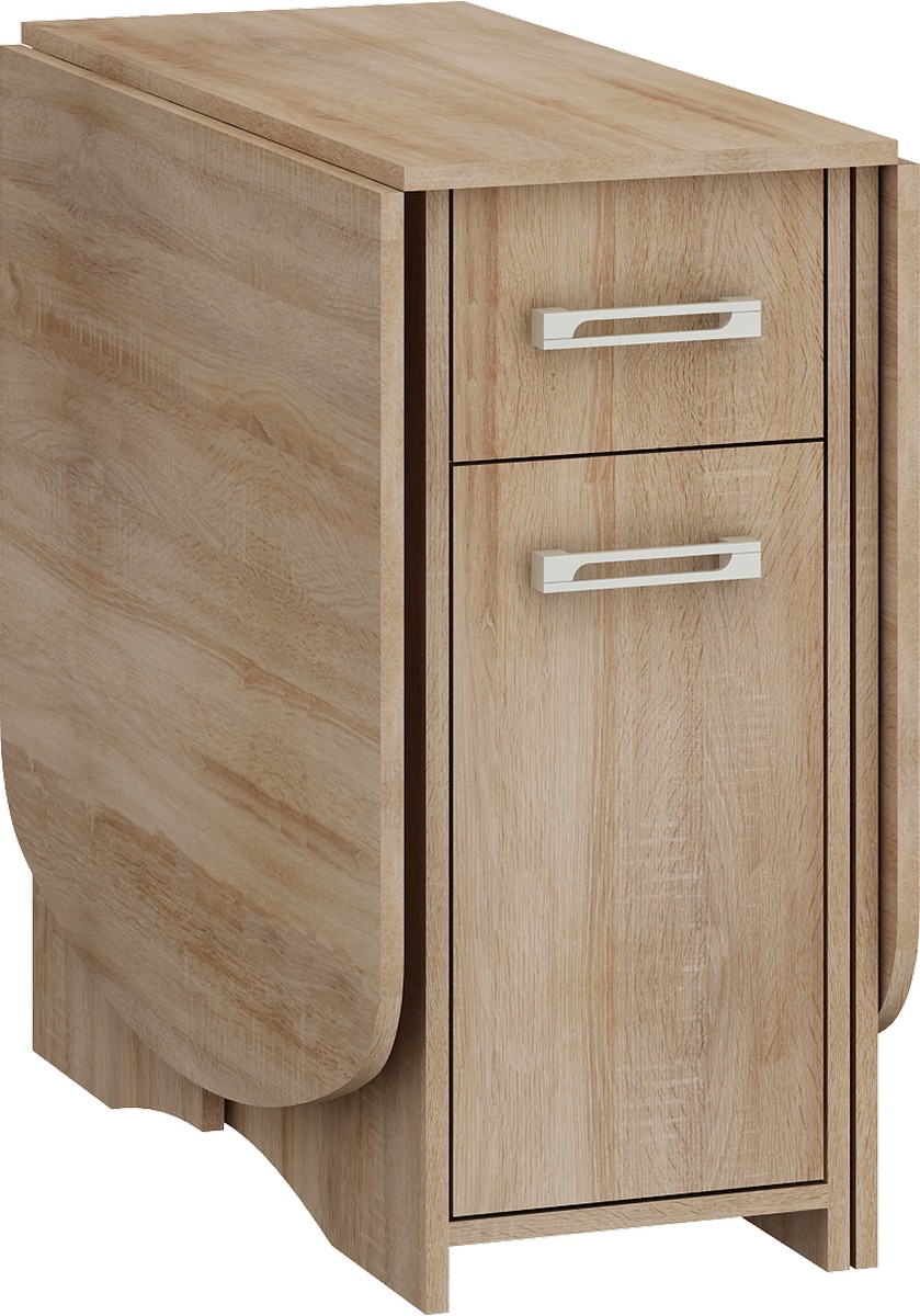 Rozkladací jedálenský stôl určených svojím skladacím riešením hornej dosky skôr do malých kuchynských priestorov. Po rozložení je vhodný pre 4 až 6 osôb (maximálna šírka 160 cm, polovičná šírka 80 cm), v zloženom stave je široký iba 40 cm a dlhý 80 cm. Sklápateľné diely hornej dosky sú upevnené na pevných pántoch na základňu stola, alebo jej strednú nohu. Sklápateľné diely sú po rozložení postavené na rozkladacích nohách dodávajú stolu stabilitu. Stôl je vybavený jednou plytšou hornou a jednou hlbšou dolnou zásuvkou, ktoré sú vnútornou súčasťou strednej nohy alebo základne. Masívne sivé vodorovné úchyty.