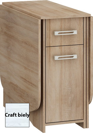 Rozkladací jedálenský stôl určených svojím skladacím riešením hornej dosky skôr do malých kuchynských priestorov. Po rozložení je vhodný pre 4 až 6 osôb (maximálna šírka 160 cm, polovičná šírka 80 cm), v zloženom stave je široký iba 40 cm a dlhý 80 cm. Sklápateľné diely hornej dosky sú upevnené na pevných pántoch na základňu stola, alebo jej strednú nohu. Sklápateľné diely sú po rozložení postavené na rozkladacích nohách dodávajú stolu stabilitu. Stôl je vybavený jednou plytšou hornou a jednou hlbšou dolnou zásuvkou, ktoré sú vnútornou súčasťou strednej nohy alebo základne. Masívne sivé vodorovné úchyty.