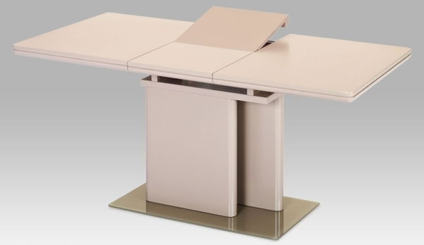 Rozkladací jedálenský stôl s moderným dizajnom je zhotovený vo vysokom lesku. Stolová doska a centrálna noha sú vyrobené z drevených MDF dosiek s polyuretánovým lesklým lakom. Stolová noha je zakončená podstavcom z farebného skla, ktoré je zladené s farbou stola. V nerozloženom stave má stolová doska rozmery pre obslúženie 4 osôb, rozložením ju možno rozšíriť o ďalších 40 cm. Stôl je tak vhodný aj pre väčšie priestory, pre väčšie rodiny. Prevedenie hnedá alebo lanýžová.