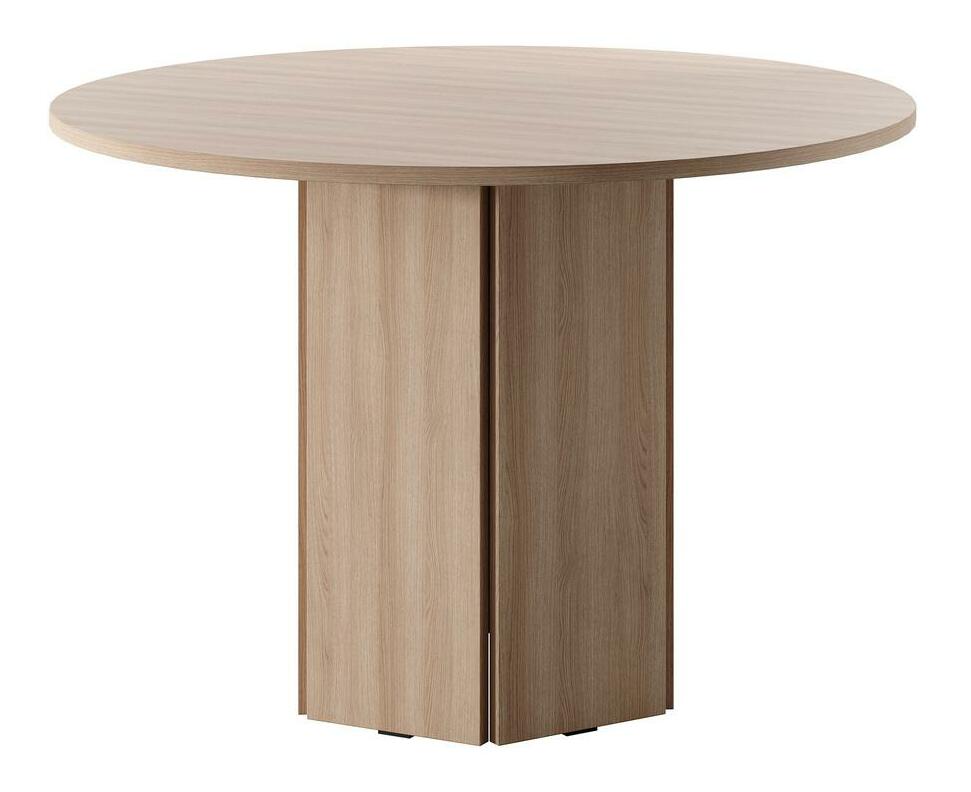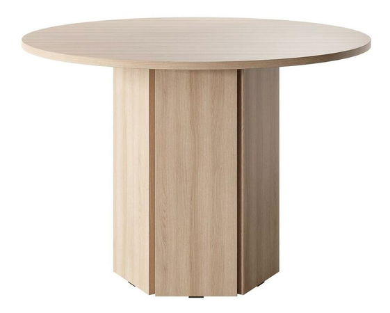 Hľadáte dizajnový stôl, ktorý spája funkčnosť s moderným vzhľadom? Stolík splní vaše očakávania Okrúhly stolík je univerzálny kus nábytku, ktorý sa hodí do mnohých interiérov a premení ich na štýlové izby priamo z časopisov o interiérm dizajne. Stôl má veľkú okrúhlu dosku a jednu pevnú nohu v tvare šesťuholníka, ktorá dodáva nábytku stabilitu a dodáva celku eleganciu Detail produktu: Nábytok je vyrobený z laminovanej dosky vo farbe R20021 LN Dub Lindberg, ktorá je odolná voči. škrabance a vlhkosť čierne nožičky s výškou 0,5 cm z odolného materiálu pripevnené ku každej doske, nepoškriabajú podlahu, vzdialenosť od nohy k okraju dosky: 28,6 cm, výška nohy: 72 cm, doska stola s. priemer 110 cm pojme 4 osoby.