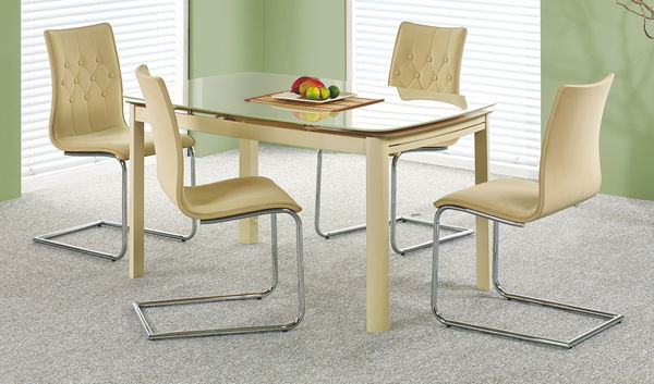Krásny a elegantný jedálenský stôl Kayden značky Halmar je viac ako vhodný do moderného interiéru. Jedálenský stôl je dodávaný v béžovom farebnom prevedení, takže je vhodný do akéhokoľvek interiéru, pretože farba je neutrálna. Kayden je vyrobený zo skla, z ktorého je vrchná tabuľa stola a z lakovanej ocele, z ktorej je vyrobený rám a nohy stola. Tento stôl pojme 6 až 8 osôb a je vhodný aj do menších priestorov, pretože ponúka rozkladací systém.