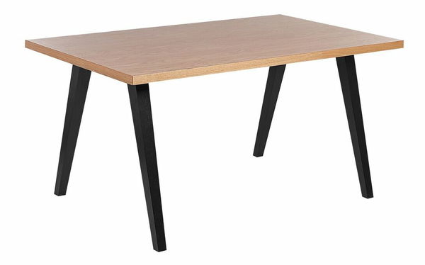 Vďaka tomuto jedinečnému kusu nábytku vytvoríte ideálne miesto na servírovanie jedla, rodinné stretnutia alebo rôzne zábavné aktivity. Stôl má mierne zošikmené drevené nohy v čiernom farebnom prevedení, ktoré sú doplnené obdĺžnikovou stolovou doskou. Doska stola je vyrobená z MDF materiálu s dyhovaným povrchom vo farbe svetlého dubového dreva. Stôl možno skombinovať s rôznym typom stoličiek - od drevených až po kovové. Jeho moderný dizajn výborne doplní interiéry zariadené v škandinávskom alebo rustikálnom štýle.