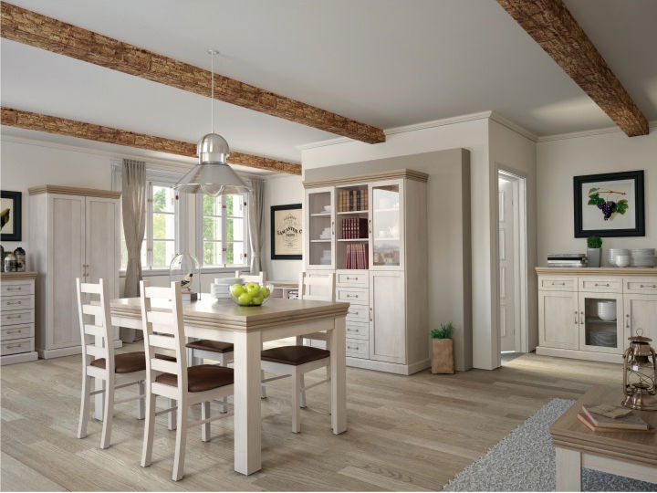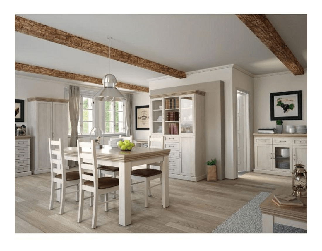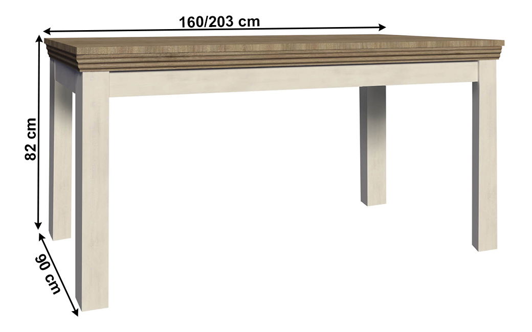 Jedálenský stôl Regnar ST je masívny a elegantný rozkladací stôl pre 6 až 8 osôb. Sosna nordická v bielej farbe a dub divoký spolu vytvárajú krásne kombinácie farieb. Tento stôl je ideálny pre tých, ktorí majú radi anglický štýl a tradičný vzhľad nábytku. Sektorový nábytok Royal z tejto radu je tiež kombináciou masívneho vzhľadu a anglického štýlu, a bielej sosny nordickej v kombinácii s dubom divokým. Tento nábytok skrášli priestor v každej izbe a určite si ho obľúbia tí, ktorí majú radi tradičný vzhľad nábytku. Rozmery stola sú 160-203x82x90 cm a hrúbka materiálu je 22 mm. Stôl sa dodáva v demonte.