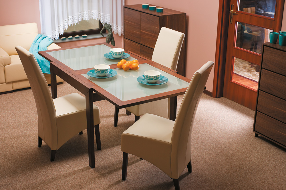 Stôl Toledo je taktiež rozkladací a vďaka umne využitému priestoru stola po rozložení sa za neho dokáže usadiť až 6 ľudí. Toledo je k dispozícií vo farbe orecha a vrchná doska pozostáva z mliečneho skla.