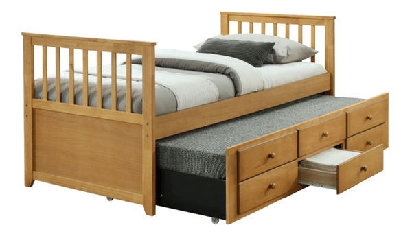 Jednolôžková posteľ Ahlan (dub) s roštom a úložným priestorom je vyrobená z kvalitného masívneho dubového dreva a MDF. Prístelka, ktorú je možné vysunúť pomocou úchytiek a na kolieskach, je vhodná aj pre deti. Posteľ je vybavená trojicou výsuvných šuplíkov na uskladnenie vecí, ako sú hračky, knihy alebo oblečenie. K posteľi je dodaný aj látkový rošt a kúpu kvalitného matraca ponúka predajca. Maximálna výška spodného matraca by nemala presiahnuť 12 cm. S rozmermi 90 x 200 cm je táto posteľ ideálna do menších priestorov.