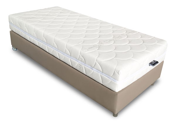 Praktické lôžko hotelového typu. Čalúnený korpus je zložený z dreveného masívneho roštu (bonell pružina), kovových nôh, ktoré majú otočné kolieska pre pohodlnú manipuláciu.