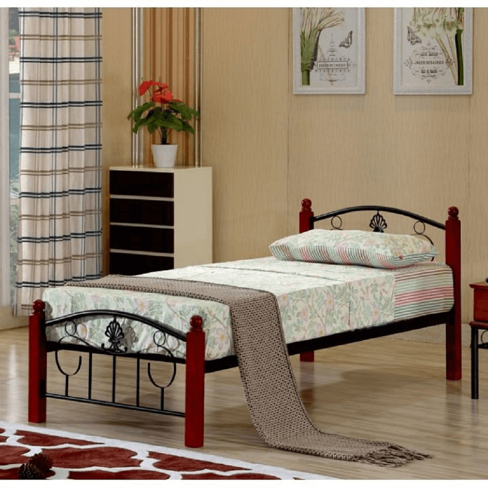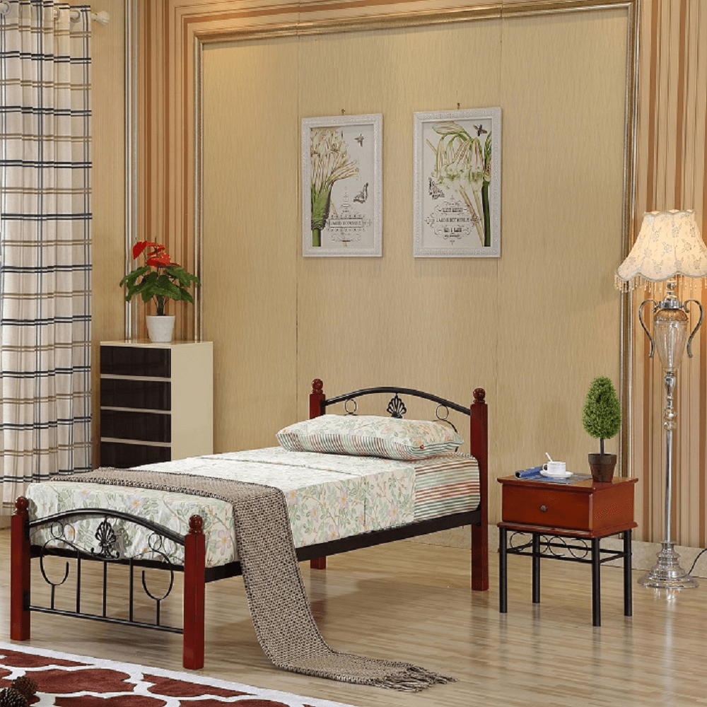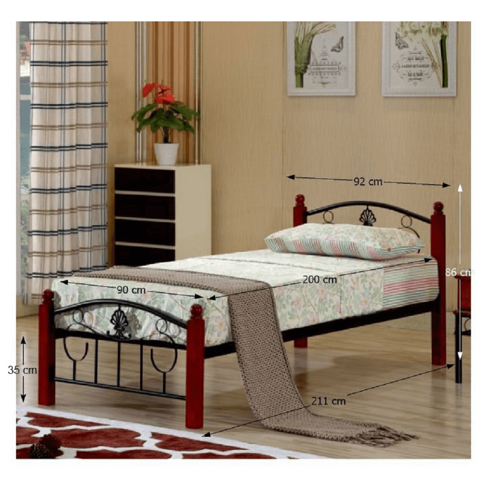 Jednolôžková posteľ Margery je vyrobená z kovu čiernej farby a má drevené nohy v tmavom dubovom odtieni. Posteľ je dodávaná s lamelovým roštom a má plochu spania 90 x 200 cm. Je vhodná pre penový matrac a má nosnosť až 100 kg. Rozmery postele sú 92 x 211 x 86 cm a je dodávaná v demonte. Možno si dokúpiť bonelový matrac z ponuky.