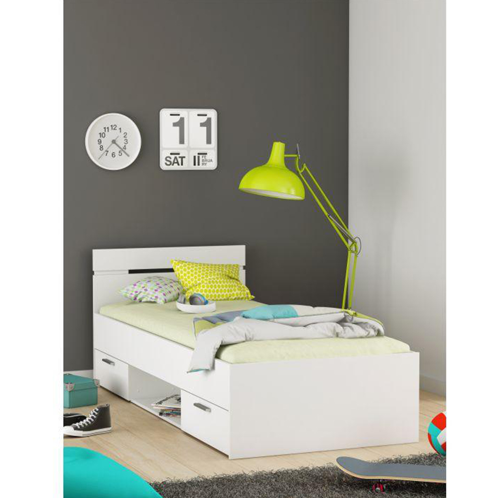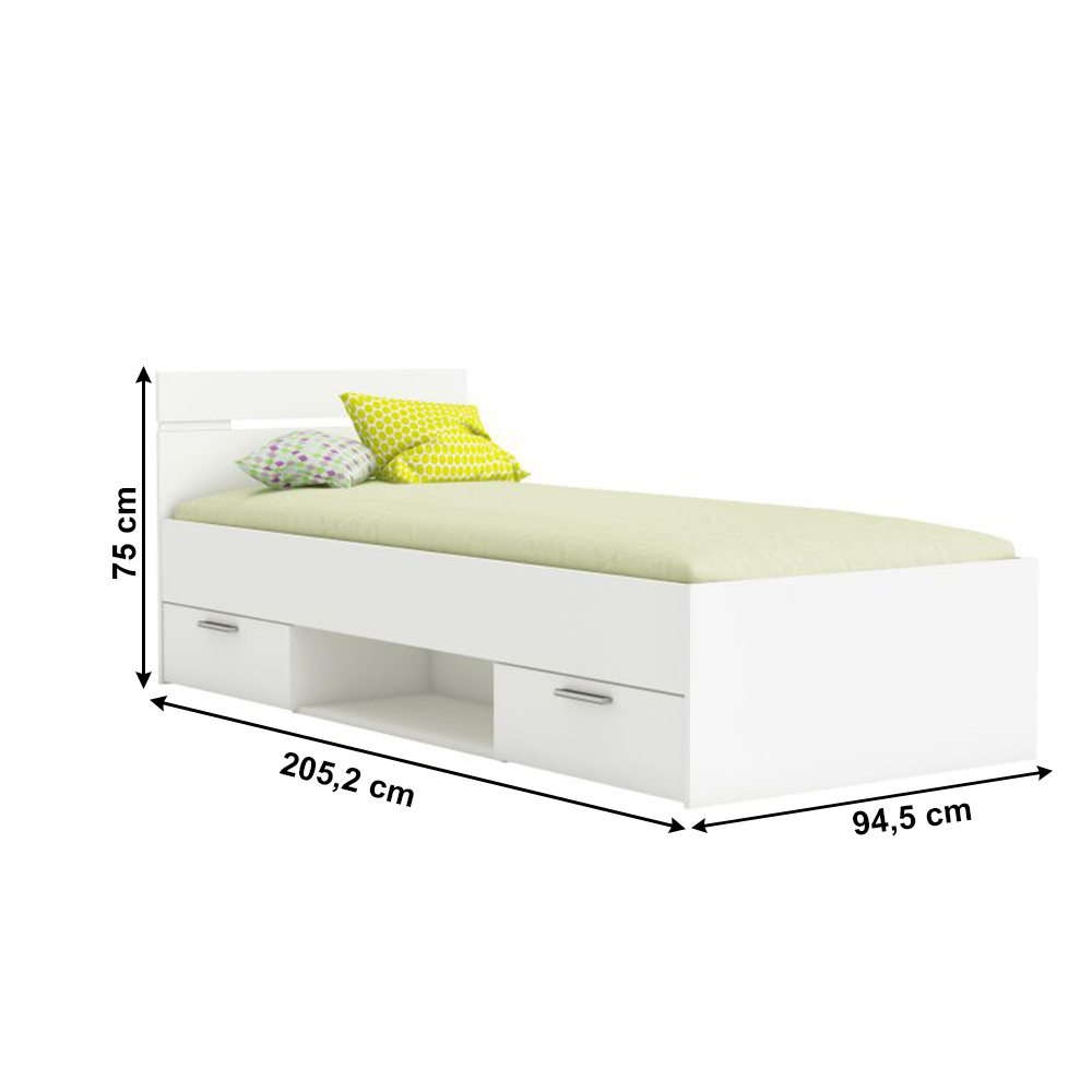 Jednolôžková posteľ Myriam v bielej farbe s eleganciou a šarmom, ktorá sa hodí do každého interiéru. S plochou na spanie 90x200 cm a výškou 75 cm a dĺžkou 205,2 cm. Posteľ má aj praktický úložný priestor, konkrétne dva šuplíky a otvorený odkladací priestor, ktoré sa nachádzajú pod posteľou. Šuplíky si môžete namontovať z pravej alebo ľavej strany. Materiál je DTD laminovaná a posteľ je odolná a pevná. Plocha na spanie je vo výške 40 cm a nosnosť je až 100 kg. Ideálna pre študentské či detské izby alebo pre každodenné použitie v spálni. Matrac a rošt nie sú súčasťou postele.