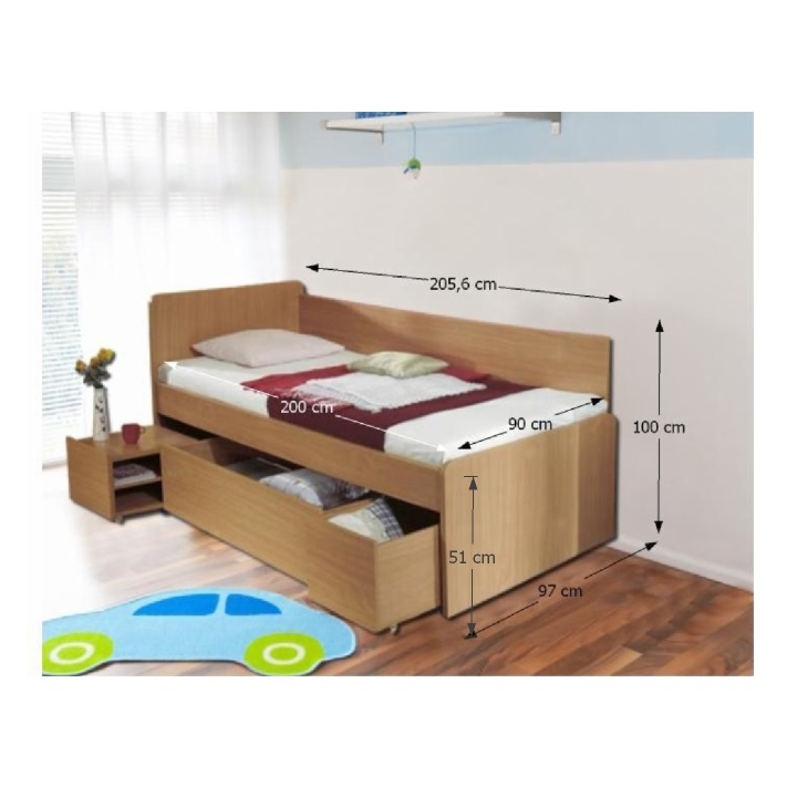 Farebné prevedenie: buk, súčasťou postele je výsuvný nočný stolík a dva šuplíky