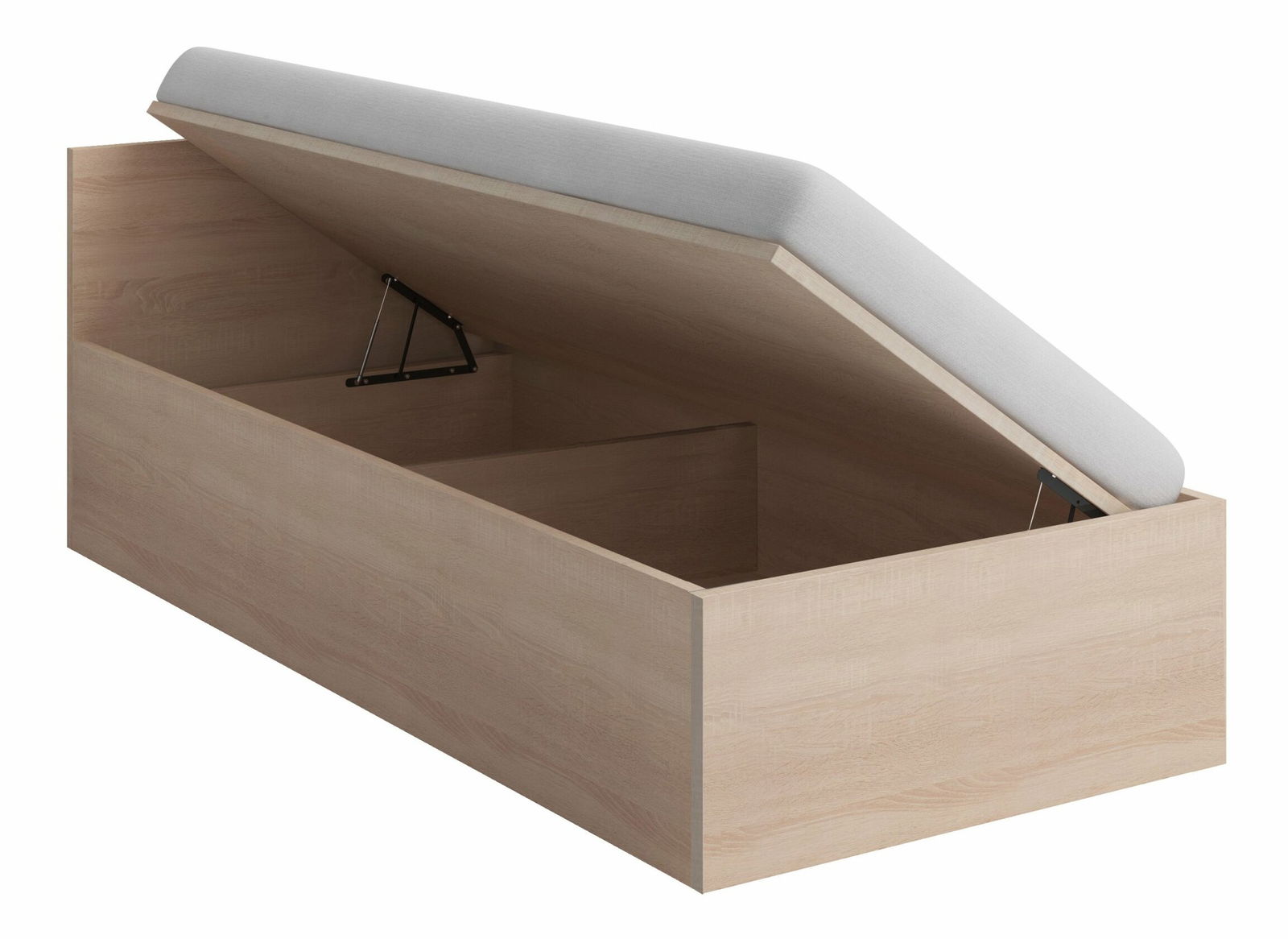 Jednolôžková posteľ Sigil III s úložným priestorom má veľkosť 90 cm x 206 cm a výšku 70 cm. Je vyrobená z kvalitnej drevotriesky s vonkajším materiálom hrúbky 22 mm a vnútorným materiálom hrúbky 16 mm. Posteľ má ABS hrany hrúbky 1,7 mm + 0,5 mm a nožičky s plastovými podložkami. V balení je zahrnutá roštová doska, matrac si môžete vybrať a objednať z nášho e-shopu. Dub sonoma farba posteľa dodáva pokojnú a modernú atmosféru do izby.
