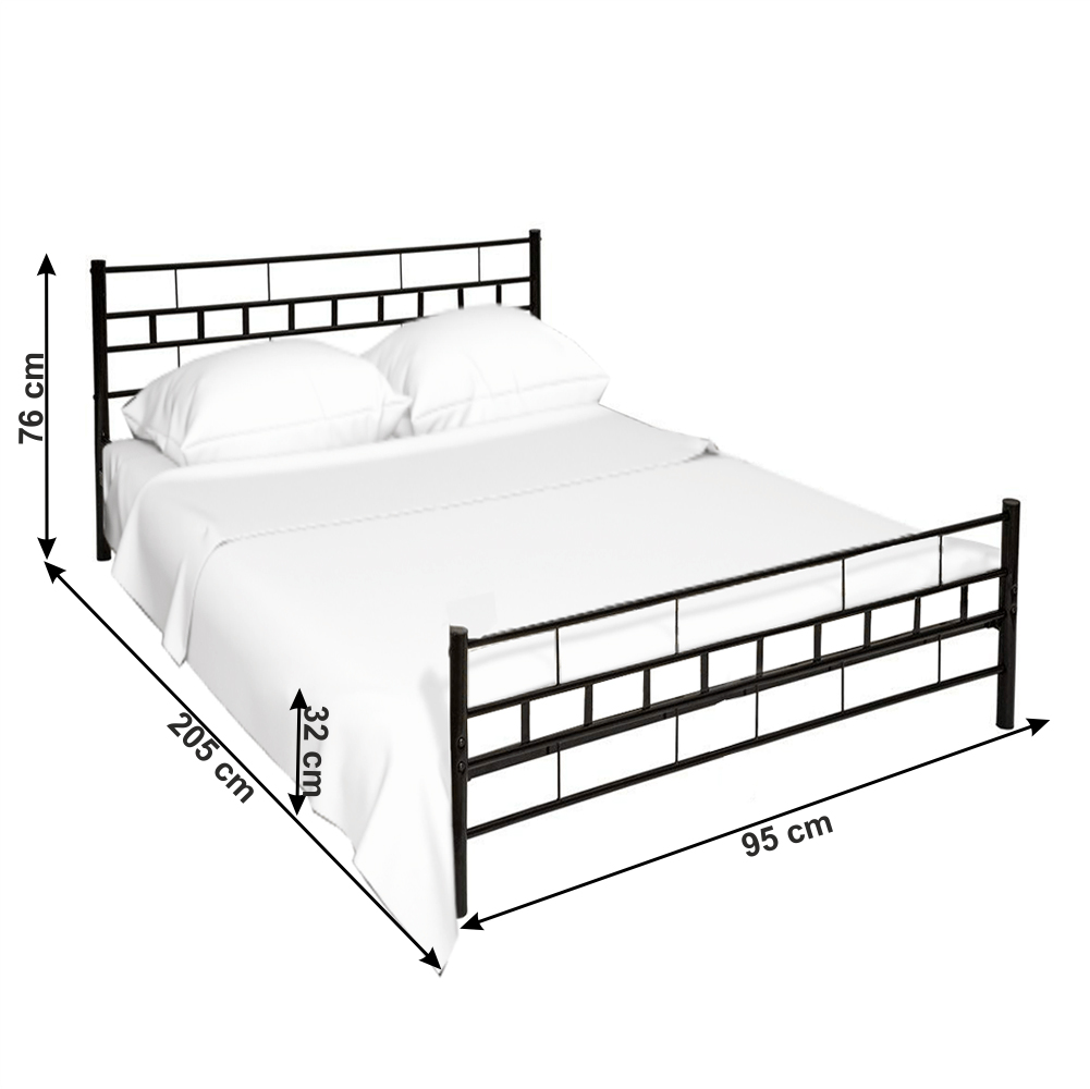 Jednolôžková posteľ Timlu 90 cm s roštom je vyrobená z kovu a má čiernu farbu. S rozmermi 95x205x76 cm a plochou na spanie 90x200 cm poskytuje dostatok miesta pre pohodlný spánok. Výška po rošte je 32 cm. Posteľ sa dodáva bez matraca, ale je možné si ho dokúpiť. Kovové čelá sú tiež súčasťou ponuky. Posteľ je dodávaná v demonte, ale jej zostavenie je jednoduché.
