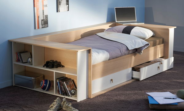 Jednolôžková posteľ vhodná do detskej alebo študentskej izby. Vďaka neutrálnej farebnej kombinácii farby dreva dub a bielej, sa hodí jak pre dievčatá, tak aj pre chlapcov. Dizajn bol navrhnutý tak, aby okrem funkcie postele, poskytovala aj potrebný odkladací priestor. Pod lôžkom sa nachádzajú dve zásuvky a na oboch čelách sú umiestnené regále. Materiál použitý pri výrobe bola laminovaná DTD. Plocha lôžka je 90x200 cm a je dodávaná bez roštu a matraca. Tie si môžete vybrať a priobjednať z našej bohatej ponuky.