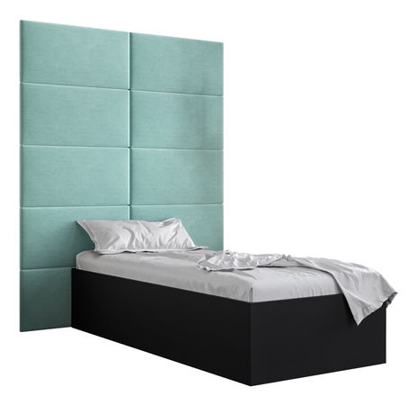 Jednolôžková posteľ s čalúneným čelom 90 cm Brittany 1 (čierna matná + mätová) (s roštom) je elegantnou a trvácnou posteľou s laminovanou doskou a odolným borovicovým roštom. Prislúchajú k nej mäkké farebné panely a tkanina Manila, ktorá je odolná voči treniu a oderu. Posteľ má plochu na spanie 90x200 cm a šírku 84 cm pre každý z 10 čalúnených panelov. Matrac nie je súčasťou ceny, no je možné si ho vybrať a priobjednať z nášho internetového obchodu.