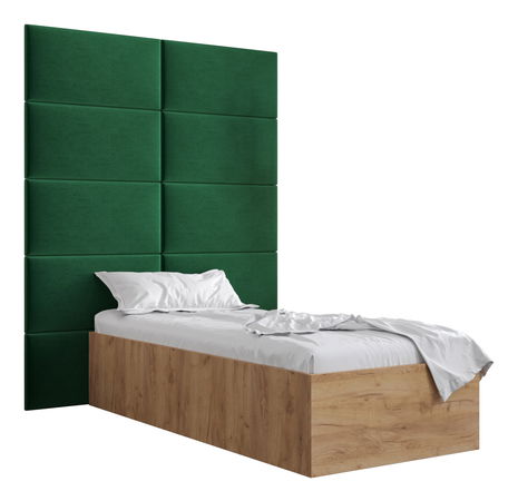 Jednolôžková posteľ s čalúneným čelom 90 cm Brittany 1 (dub craft zlatý + zelená) (s roštom) je elegantná posteľ s jednoduchými líniami a širokou škálou farieb. Pevná konštrukcia z laminovanej dosky a odolný rošt z borovicového dreva zaručia pohodlné používanie na roky. K posteli sú priložené farebné panely, ktoré dodajú nevšedný vzhľad. Posteľ má plochu na spanie 90x200 cm, korpus z laminovanej dosky 16 mm a rošt z borovicového dreva. Posteľ je vhodná pre pružinové alebo taštičkové matrace s minimálnou výškou 15 cm. Čalúnené panely sú vyrobené z hrubej dosky, peny T18 a látky Manila, ktorá je trvácna a odolná voči treniu a oderu. Posteľ je dodávaná bez matraca a je zabalená v 1 balíku o rozmeroch 211x54x5 cm a hmotnosti 31,5 kg, a balík s panelmi o rozmeroch 10 kusov po 85x43x2 cm a hmotnosti 0,70 kg.