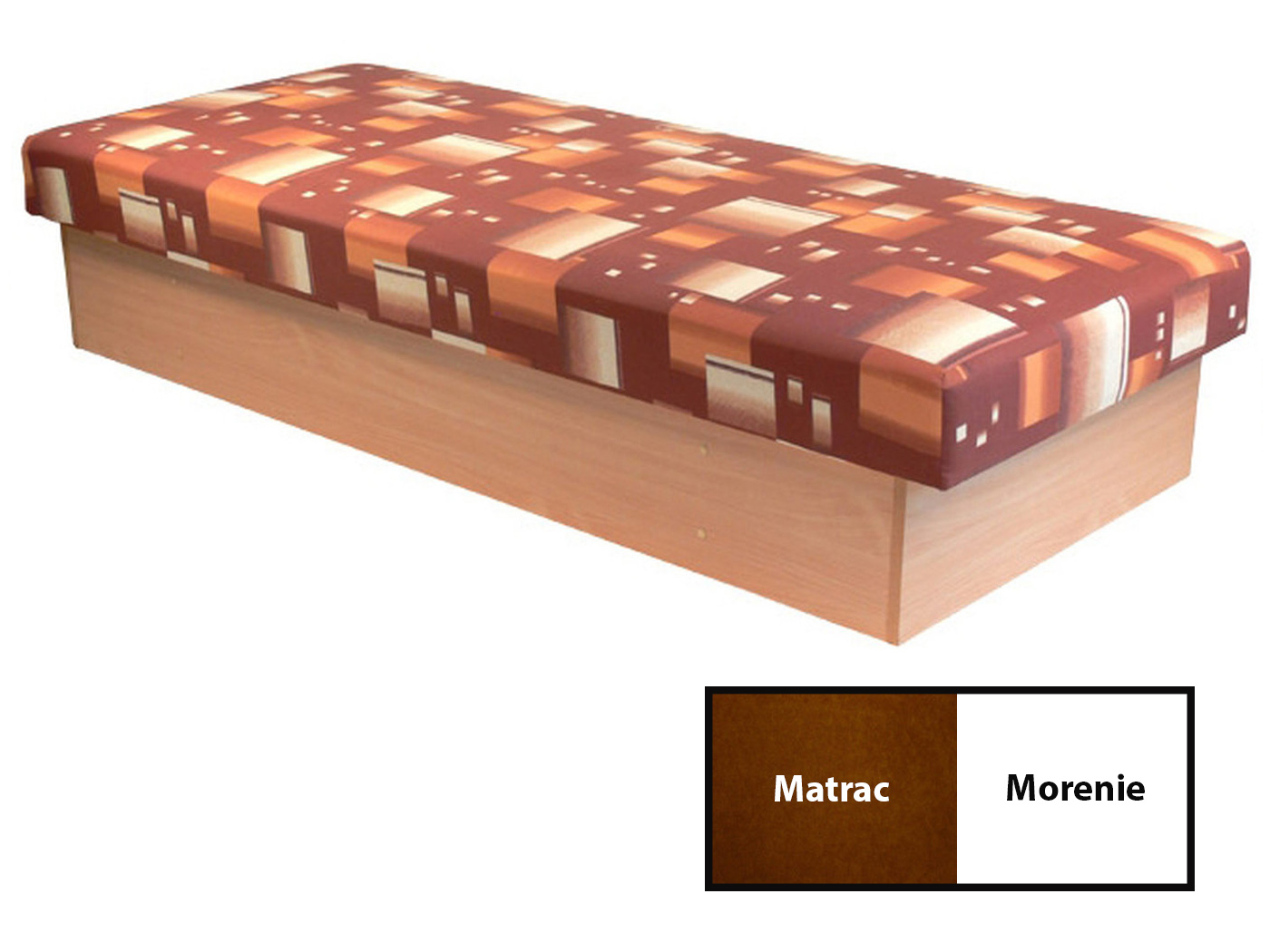 Matrac postele sa poťahuje jednou Vami vybranou čalúnickou látkou a korpus dreva postele sa morí do Vami vybraného odtieňa.