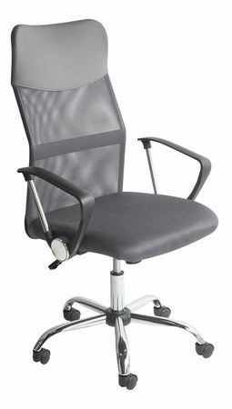 Táto kancelárska stolička v ergonomickom dizajne poskytne správnu oporu vášmu telu počas dlhých hodín strávených pri práci. Nastaviteľná výška sedadla a 360° otočný mechanizmus vám umožní prispôsobiť si sedadlo podľa vašich preferencií. Kovová pochrómovaná základňa má 5 hladko sa otáčajúcich koliesok. Hrubé sedadlo je čalúnené sivou priedušnou sieťovinou a kvalitnou umelou kožou na opierke hlavy.