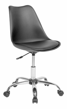 Táto praktická stolička na kolieskach sa stane nenahraditeľným doplnkom každého pracovného priestoru. Ergonomicky tvarované sedadlo poskytuje maximálny komfort a je vyrobené z odolného syntetického materiálu so sedadlom z umelej kože. Robustný kovový rám poskytuje odolnosť a zaisťuje stabilitu stoličky. Stolička je otočná a má plynový zdvih, ktorý umožňuje nastavenie výšky. Kolieska sú vybavené ochrannými podložkami, ktoré chránia podlahu pred poškriabaním. Táto kancelárska stolička je dobrou voľbou do interiérov v škandinávskom, retro alebo modernom štýle.