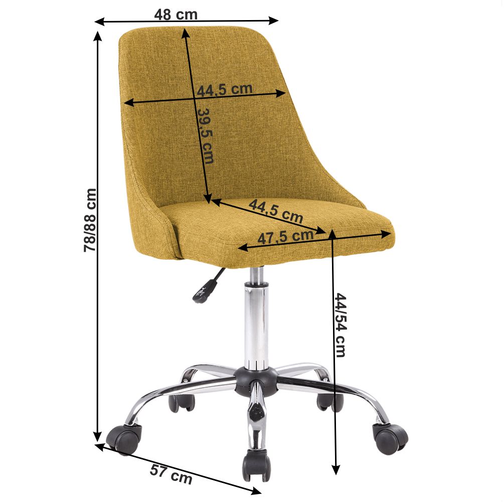 Kancelárska stolička Eminence (žltá + chróm) je štýlová a minimalistická stolička, ktorá má nastaviteľnú výšku sedu. Je ideálna pre kanceláriu alebo pracovňu. Stolička je vyrobená z vysokokvalitného materiálu, ktorý je odolný a má nosnosť až 110 kg. Nastavenie výšky sedu je 44-54 cm, hĺbka sedu je 44,5 cm a šírka sedu je 47,5 cm. Rozmery operadla sú 39,5x44,5 cm. Stolička je vyrobená z látka a chrómu. Je dodávaná v demonte, ale je ľahko montovateľná.