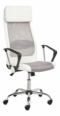 Štýlová a praktická kancelárska stolička je nevyhnutnou súčasťou každého pracovného priestoru. Táto stolička má otočnú základňu na kolieskach a výškovo nastaviteľné sedadlo, ktoré možno nastaviť podľa individuálnych potrieb. Vďaka kombinácii bielej umelej kože a sieťoviny je priedušná a odolná. Vysoké operadlo s opierkou hlavy zaručuje celkovú oporu chrbtice a tela.