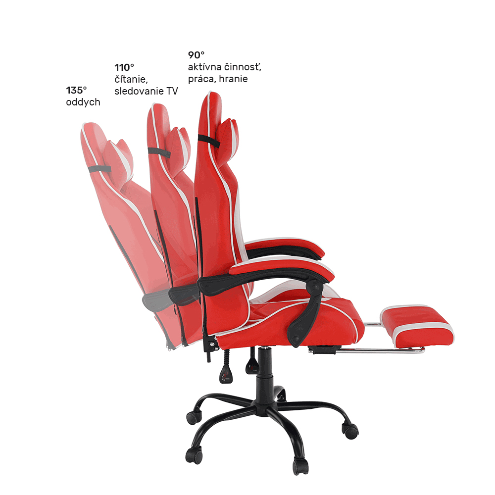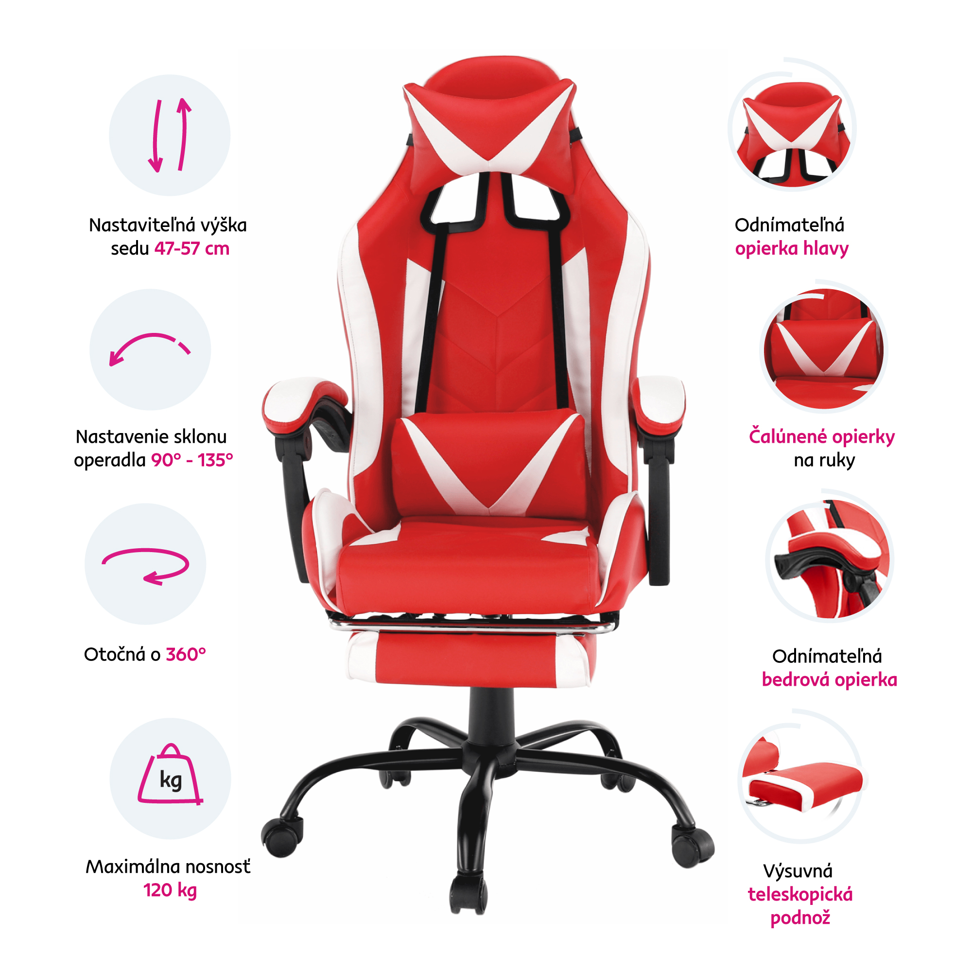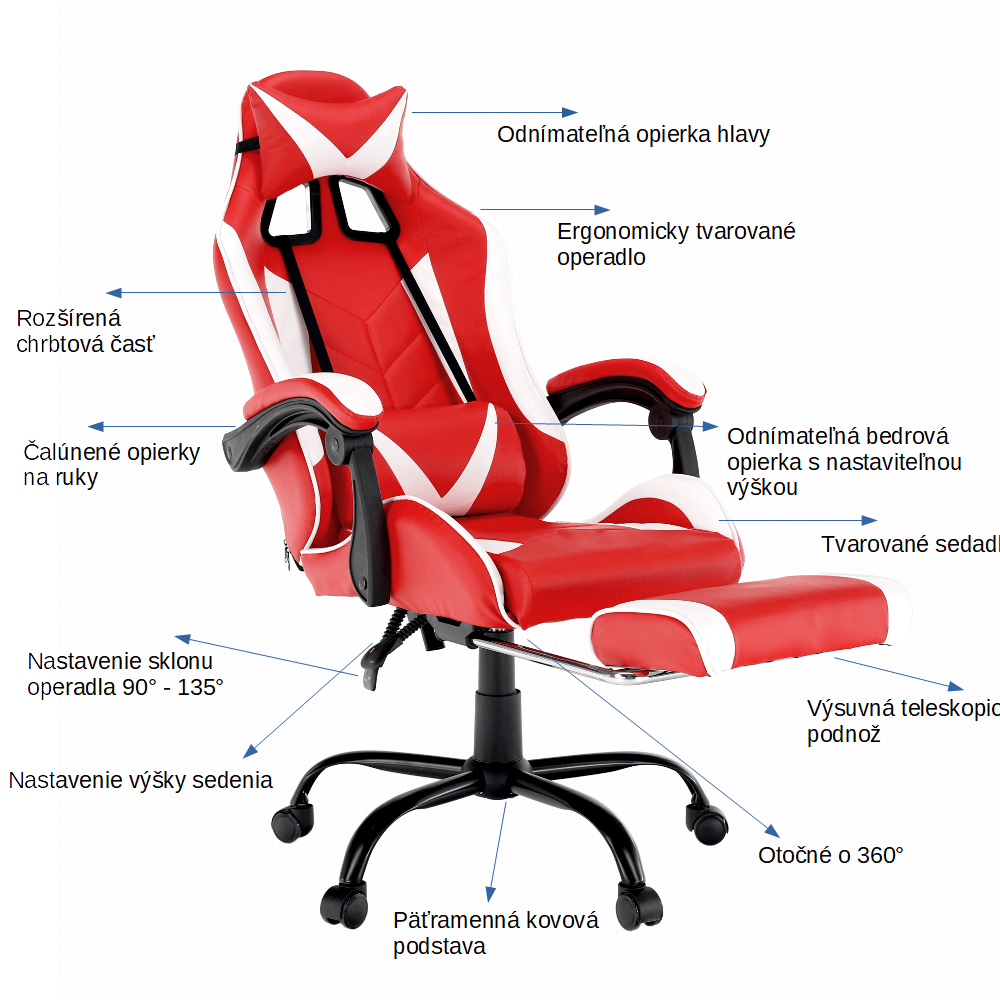 Herné,Výsuvná teleskopická podnožka,Otočná o 360°,Nastavenie sklonu operadla 90° - 135°,Odnímateľná bedrová opierka a opierka hlavy,Ergonomicky tvarované vysoké operadlo,Rozšírená chrbtová časť,Tvarované sedadlo,Opierky na ruky sú čalúnené,Päťramenná kovová podstava