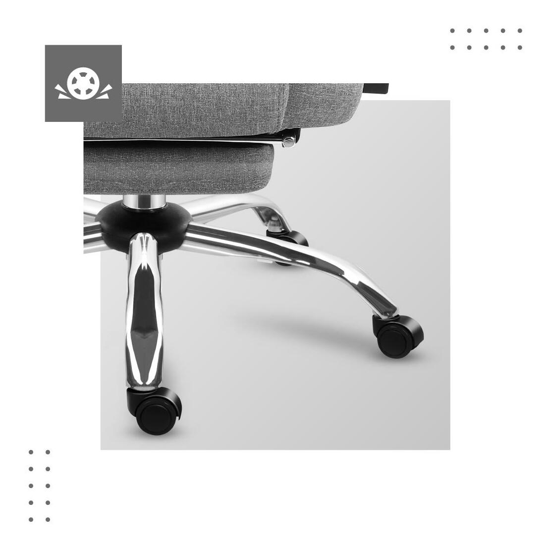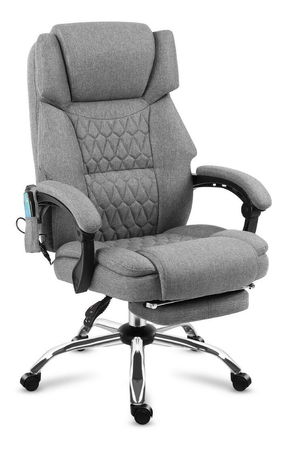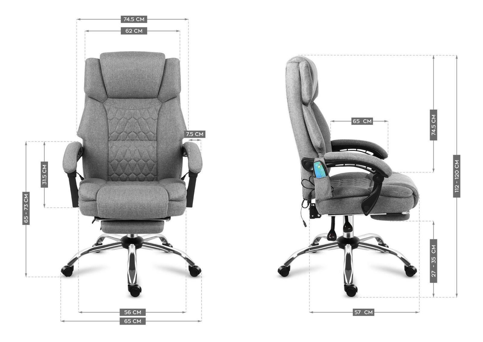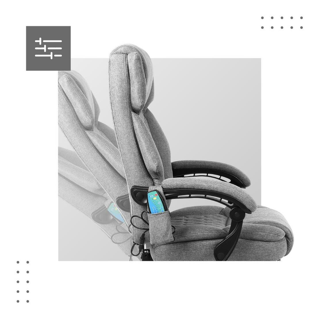 Pre najvyšší komfort je kreslo vybavené masážnou funkciou pomocou vibračných bodov umiestnených v operadle. 4 vibračné motory, umiestnené v hornej a spodnej časti chrbtovej opierky, zaručujú komplexnú masáž chrbta. Dva časové režimy (15/30 minút) vám umožnia odpočívať bez počítania času – nastavte si časovač a relaxujte tak dlho, ako potrebujete. Relaxačná masáž pomocou vibračných bodov zvyšuje komfort používania kresla, pomáha znižovať stres a uvoľňuje napäté svaly. Zaoblené, mäkké podrúčky poskytujú optimálnu oporu pre ruky a predlaktia. 9 presne naprogramovaných vibračných režimov vám umožní prispôsobiť typ masáže vašim aktuálnym potrebám. 3 úrovne vibrácií – nízka, stredná a vysoká, umožňujú prispôsobiť intenzitu masáže vašim preferenciám. Nízke vibrácie sú ideálne pre ľahkú masáž pri práci a vysoké vibrácie zaručia úplné uvoľnenie aj počas krátkej prestávky. Nastavenie masáže zabudované v chrbtovej opierke môžete jednoducho zmeniť pomocou diaľkového ovládača - intuitívny ovládač umožňuje ovládať režimy, úroveň intenzity masáže a nastavenie časovača zo sedu. Kreslo je vybavené funkciou vyhrievania, ktorá podporuje krvný obeh a zvyšuje svalovú relaxáciu. Režim ohrevu môžete použiť samostatne alebo spolu s vibráciou. Výsuvná opierka nôh vám umožňuje zaujať správnu polohu pri sedení pri práci a odpočinku. Funkcia SeatRest umožňuje naklonenie operadla do vami zvolenej polohy. Široký sedák, vstavaná opierka hlavy a sklopné operadlo uľahčujú udržanie správnej polohy sedenia. Vďaka možnosti nastavenia výšky sedadla je masážne kreslo kompatibilné s akýmkoľvek pracovným stolom. olyuretánovo-gumové kolieska s priemerom 50 mm zaručujú plynulý a tichý pohyb bez strachu z poškriabania podlahy.
