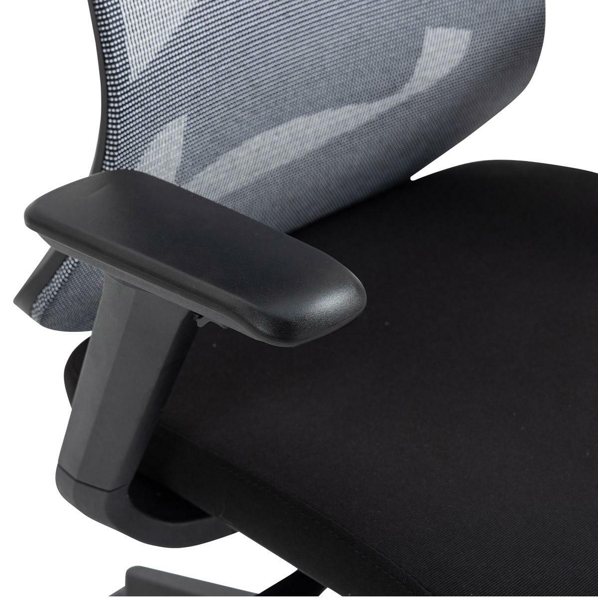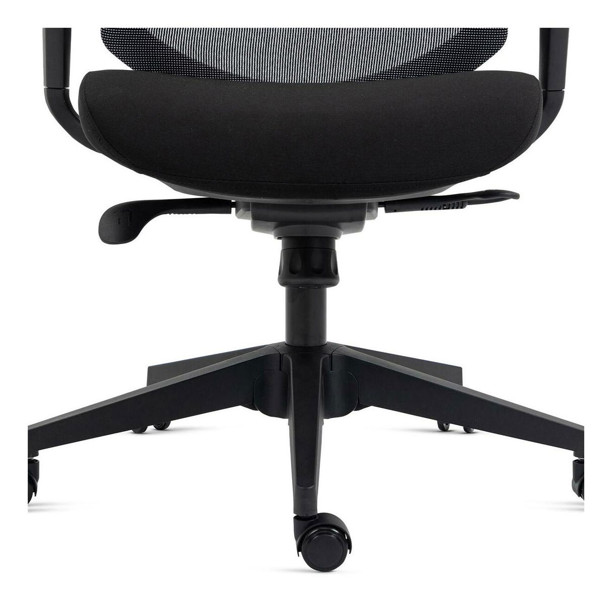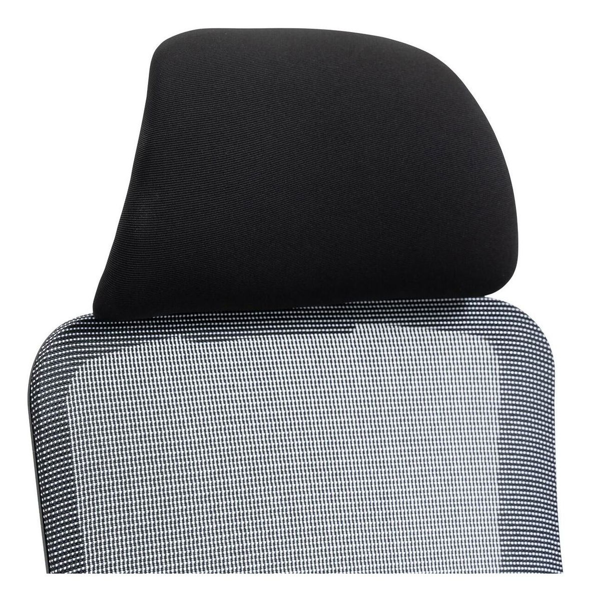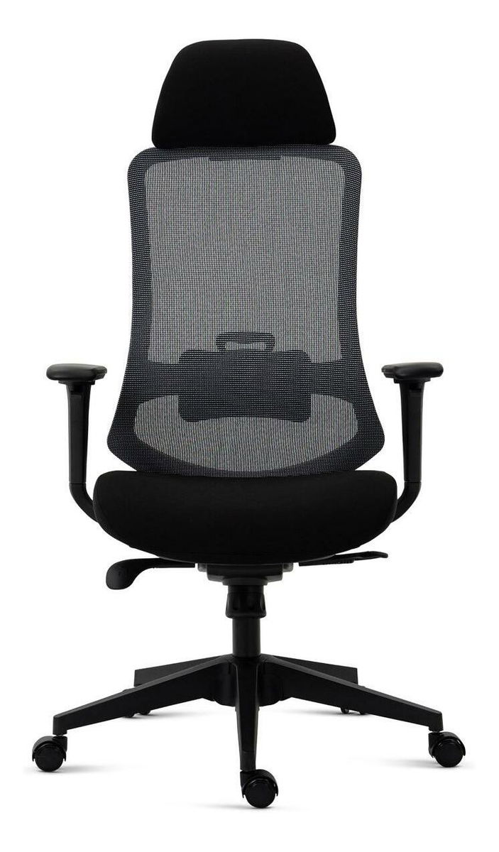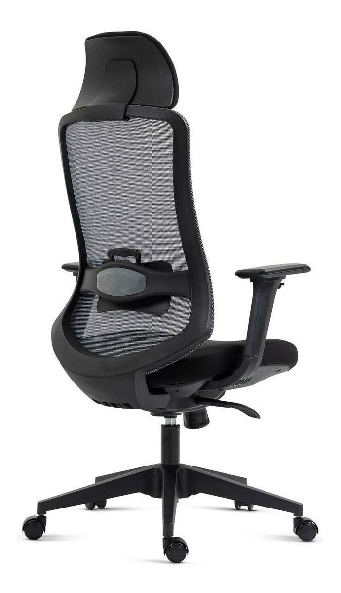 ZobraziťKancelárska stolička s vysokým operadlom, čalúneným v priedušnom materiáli MESH, s nastaviteľnou bedrovou opierkou. Sedák je zmäkčený, s poťahom v čiernej látke. Pre väčšie pohodlie je stolička vybavená synchrónnou mechanikou s polohovacou aretáciou, podhlavníkom a 4D podrúčkami z vrchnej časti z PU peny. Kríž z odolného plastu je opatrený kolieskami na tvrdé povrchy.