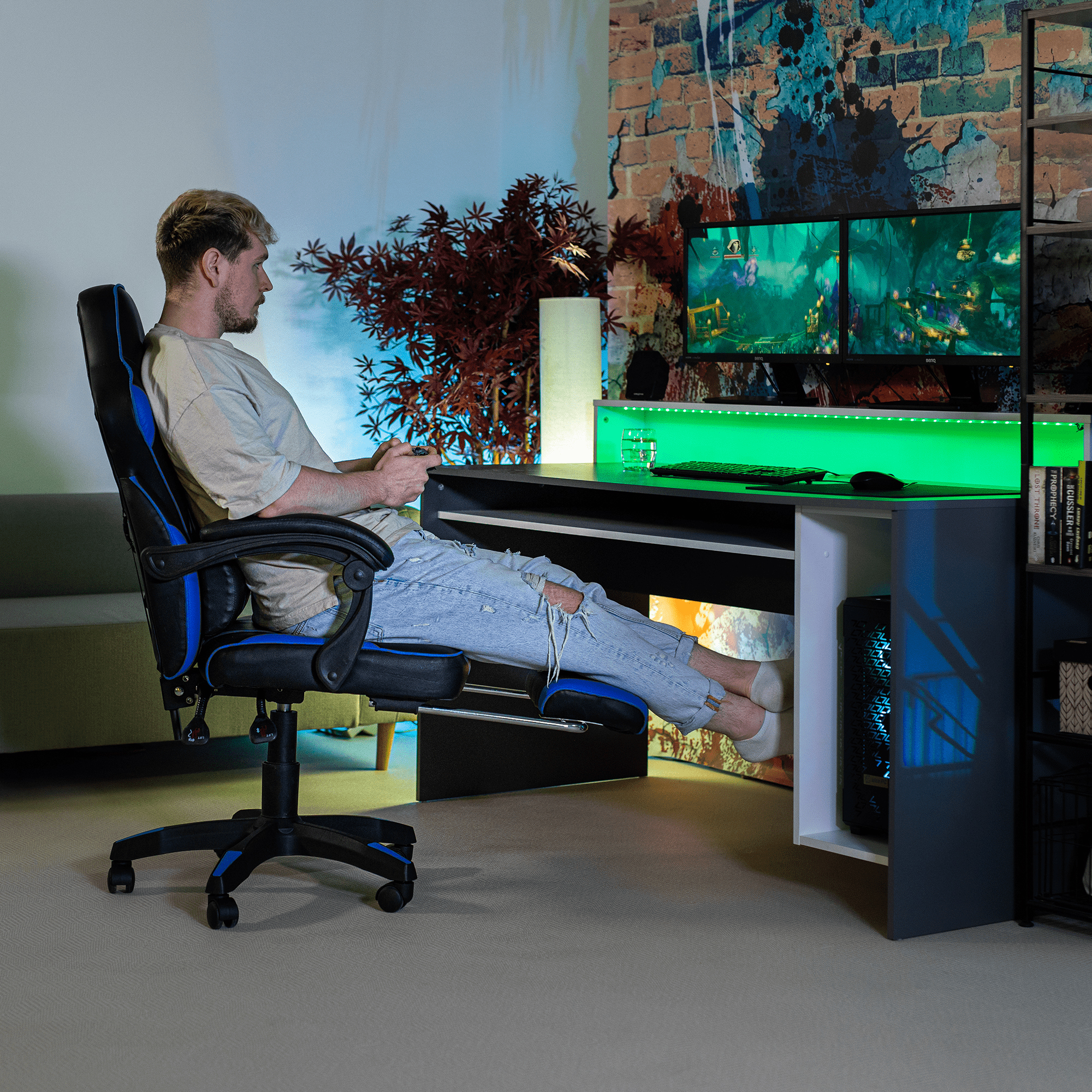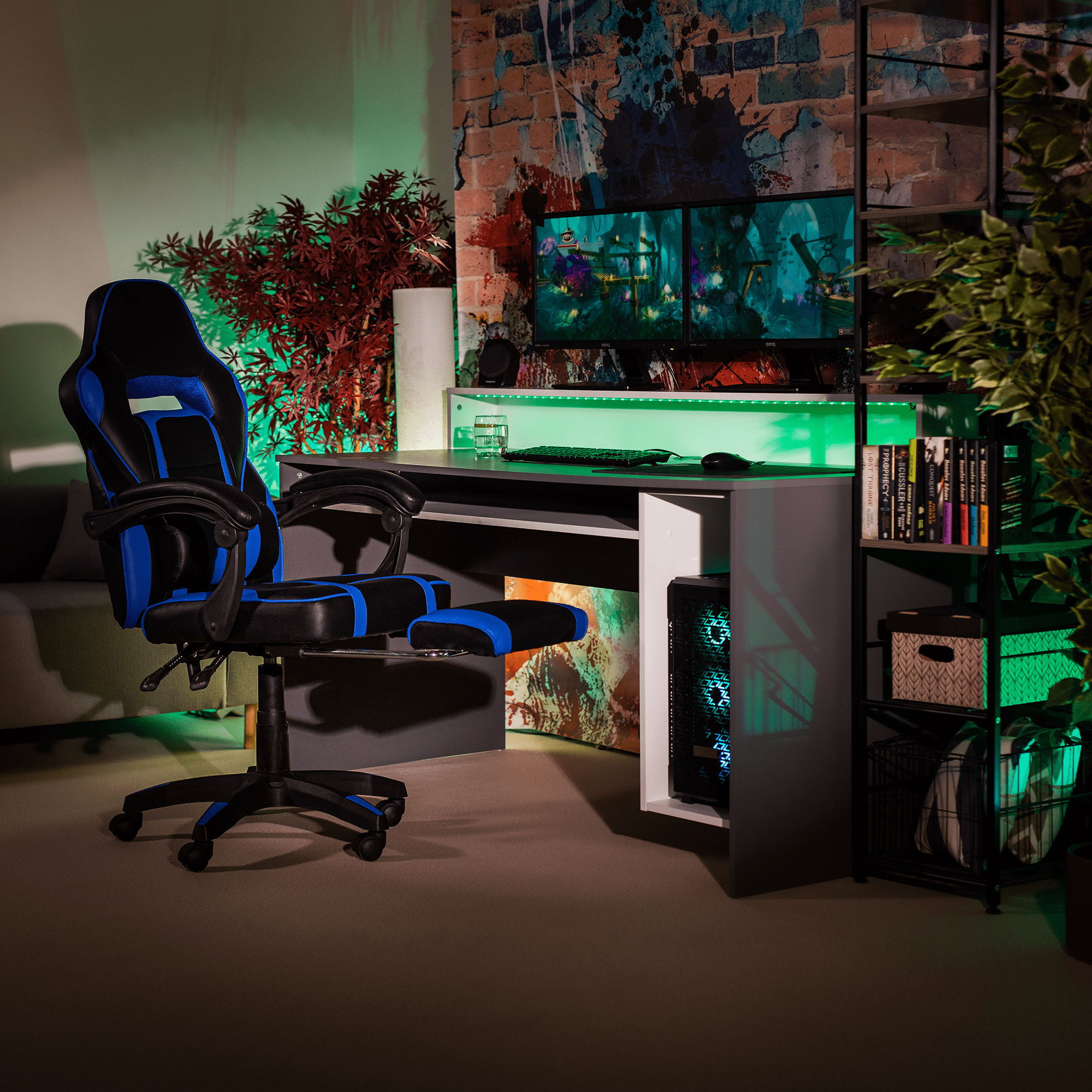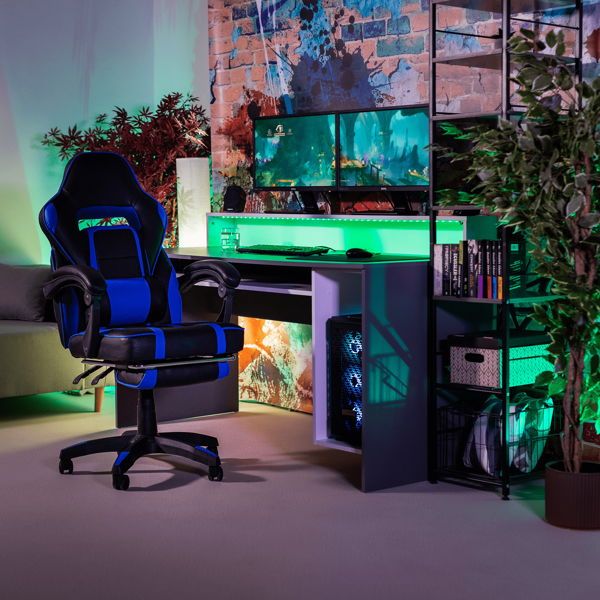 Herné kancelárske kreslo Gazania modrej farby je vybavené ergonomickým operadlom, predĺženým operadlom, nastaviteľnou bedrovou výškou, tvarovaným sedadlom a čalúnenými plastovými podrúčkami. Kreslo stojí na päťramennej plastovej základni. Materiál kresla je ekokoža, drevo a plast. Rám kresla je vyrobený z dreva a opierka je z plastu. Šírka sedu je 52 cm a hĺbka sedu je 45-55 cm. Výška chrbtovej opierky je 59 cm a šírka chrbtovej opierky je 53 cm. Kreslo má maximálnu nosnosť 110 kg a otočnú osu 360°. Operadlo je možné nastaviť v sklon 90°-135°. Kreslo sa dodáva v demonte.