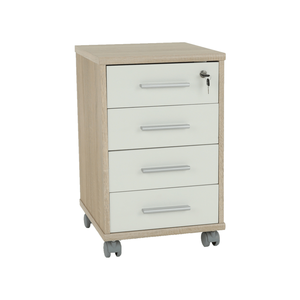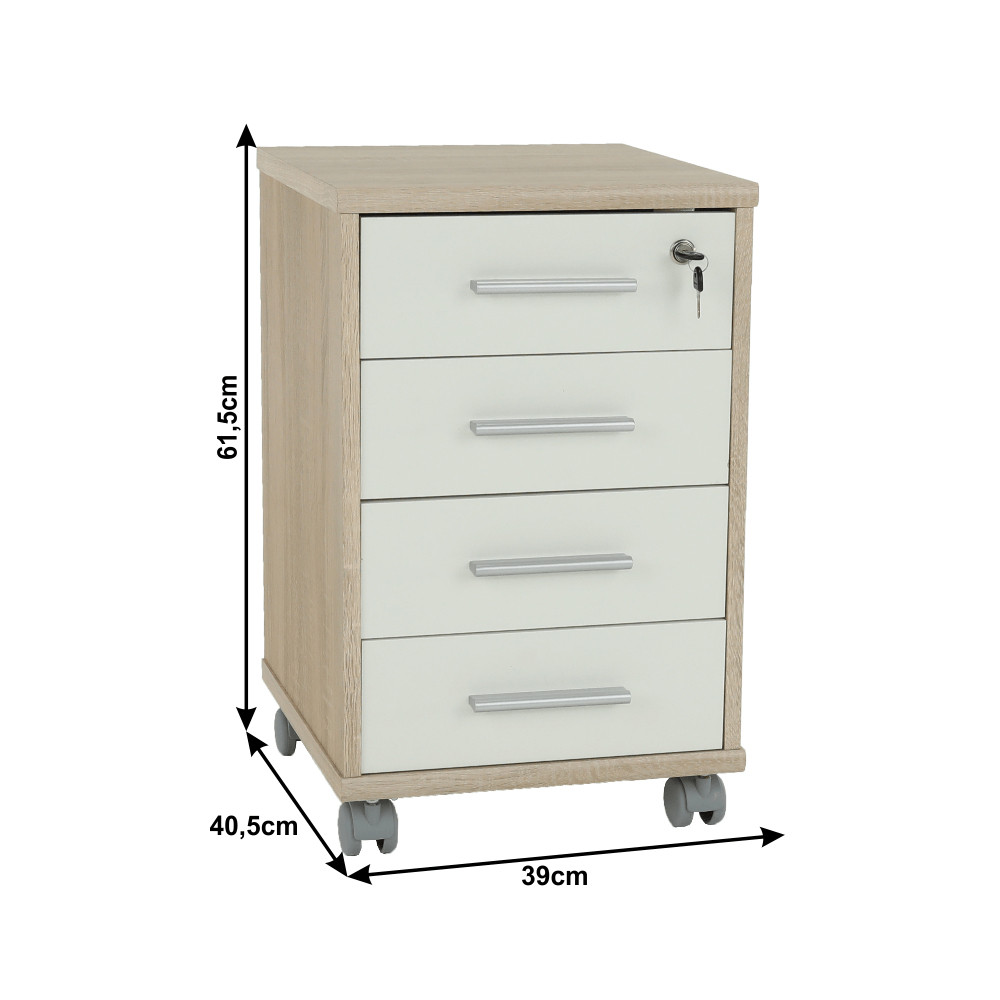 Kancelársky kontajner Hansa 2 NEW 12 (dub sonoma + biela) je praktický a jednoduchý kontajner, ktorý pomôže udržať pracovný stôl v poriadku. Obsahuje štyri zásuvky, pričom vrchnú je možné uzamknúť a v nej si uložiť cennosti. Kontajner má štyri kolieska, čo umožňuje jeho ľahké presúvanie po priestore. Má nosnosť až 15 kg a jednotlivé zásuvky majú nosnosť až 5 kg. Zásuvka má rozmery 12,5x34,8x35,6 cm a kontajner je vyrobený z DTD laminovanej dosky s ABS hranami. Produkt sa dodáva v demonte.