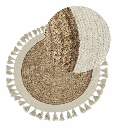 S týmto nádherným kobercom vnesiete do interiéru štipku boho štýlu. Je vyrobený z odolných materiálov, juty a bavlny, ktoré sú nenáročné na údržbu. Okrúhly tvar koberca dopĺňajú ozdobné strapce. Vďaka dizajnu a kombinácii neutrálnych farieb sa hodí k rôznym štýlom interiérového zariadenia, no najlepšie vynikne v interiéroch v tradičnom alebo boho štýle. Skrášlite si obývaciu izbu alebo spálňu týmto jedinečným doplnkom.