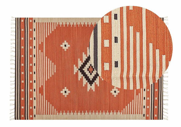 Tento kelímový koberec je ručne utkaný z bavlny a okrem toho, že je odolný a kvalitný, zútulní váš domov hrejivými farbami. Vďaka štýlovému geometrickému vzoru vnesie eleganciu a pohodlie do každej miestnosti, do ktorej ho umiestnite. Obojstranný dizajn vám umožní bez námahy zmeniť vzhľad miestnosti podľa aktuálnej nálady. Koberec je vhodný na pranie v práčke, čo zaručuje jednoduchú údržbu a zachovanie nadčasového vzhľadu. S týmto jedinečným kelímovým kobercom, ktorý je kombináciou sofistikovaného dizajnu a pohodlia, bude váš domov vyzerať naozaj výnimočne.