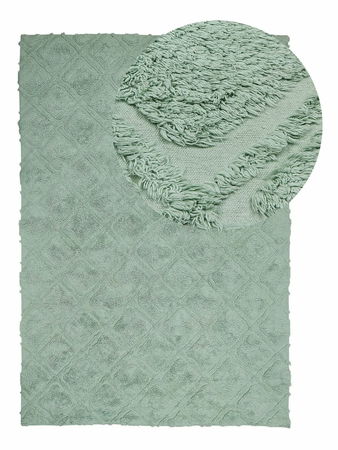 Doplňte vzhľad svojej obývacej izby alebo spálne týmto kobercom, ktorý oživí vzhľad celého interiéru. Ručne všívaný koberec s tkaným geometrickým vzorom v príjemnom odtieni zelenej je nádhernou dekoráciou, ktorú možno umiestniť vedľa postele alebo pohovky. Ak chcete vytvoriť minimalistický a zároveň eklektický dizajn, skombinujte ho s doplnkami v tlmených farbách.