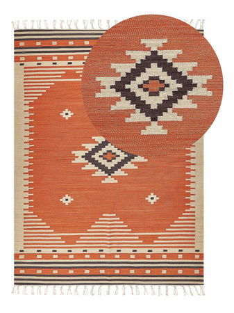 Tento kelímový koberec je ručne utkaný z bavlny a okrem toho, že je odolný a kvalitný, zútulní váš domov hrejivými farbami. Vďaka štýlovému geometrickému vzoru vnesie eleganciu a pohodlie do každej miestnosti, do ktorej ho umiestnite. Obojstranný dizajn vám umožní bez námahy zmeniť vzhľad miestnosti podľa aktuálnej nálady. Koberec je vhodný na pranie v práčke, čo zaručuje jednoduchú údržbu a zachovanie nadčasového vzhľadu. S týmto jedinečným kelímovým kobercom, ktorý je kombináciou sofistikovaného dizajnu a pohodlia, bude váš domov vyzerať naozaj výnimočne.