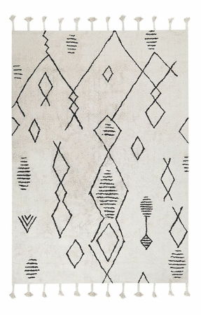 Vďaka tomuto izbovému kobercu bude váš interiér mimoriadne útulný. Koberec s krásnym geometrickým vzorom a dekoratívnymi strapcami vytvára v kombinácii s neutrálnymi farbami jedinečný dizajn, ktorý sa hodí k mnohým štýlom. Umiestnite ho vedľa postele alebo pohovky a tešte sa z krásneho dizajnového kúsku.