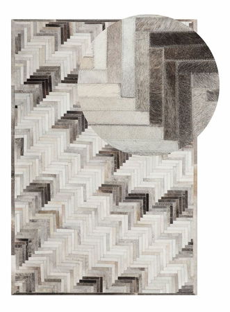 Tento elegantný patchworkový koberec je kombináciou malých kúskov kože, ktoré spolu vytvárajú klasický geometrický vzor. Teplé odtiene sivej, béžovej a hnedej sa navzájom dopĺňajú a vytvárajú luxusný dizajn, ktorý sa stane stredobodom akéhokoľvek priestoru.