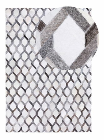 Tento obdĺžnikový koberec zútulní akýkoľvek obytný priestor. Je ručne tkaný z kvalitnej kože a má plstenú podšívku, ktorá ochráni podlahu pred poškodením. Vďaka výraznému diamantovému vzoru a teplým odtieňom béžovej a sivej bude váš domov štýlový a útulný.