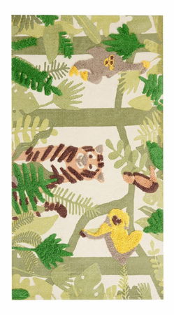 Tento okúzľujúci a roztomilý koberec vytvorí v izbe vášho dieťaťa atmosféru ako v pravej džungli. Vďaka motívu zvierat a rastlín podnieti predstavivosť vašich detí a povzbudí ich k hre. Je vyrobený z mäkkej a odolnej bavlny, poskytuje pohodlný a bezpečný priestor pre malých dobrodruhov a protišmyková spodná vrstva zaisťuje stabilitu.