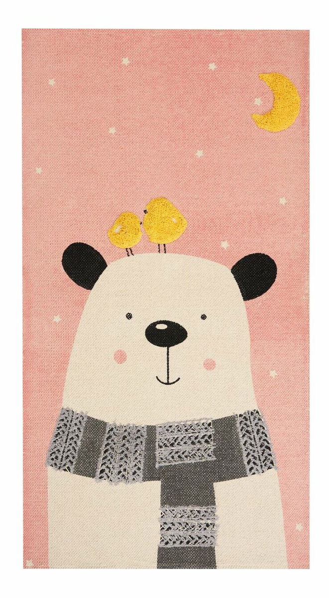 Zútulnite detskú izbu týmto farebným kobercom s motívom roztomilého medveďa s dvoma vtáčikmi sediacimi na jeho hlave, ktorý vytvorí hravú a veselú atmosféru v izbe vášho dieťaťa. Koberec je vyrobený z jemnej bavlny, je príjemný na dotyk a nenáročný na údržbu.