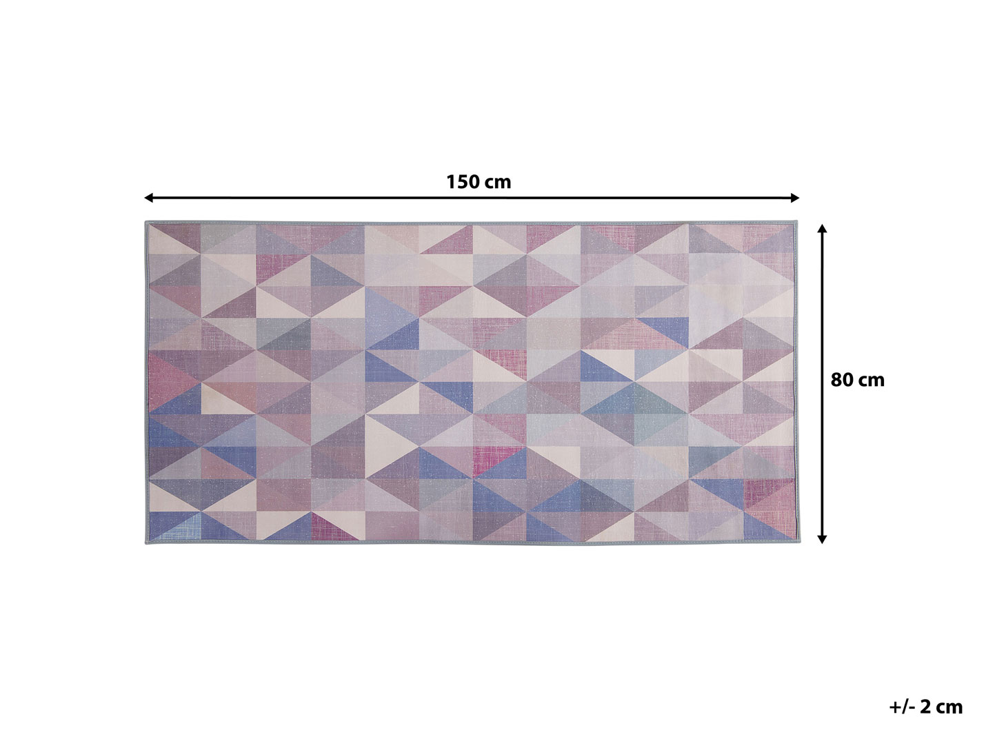 Tento koberec je vhodnou voľbou do moderných interiérov. Jeho geometrický vzor, ktorý sa skladá z množstva malých trojuholníkov, vytvára krásny patchworkový dizajn. Jemné odtiene modrej, sivej a ružovej doplnia vzhľad akejkoľvek miestnosti a nenarušia jej celkový dizajn. Vďaka protišmykovej spodnej vrstve je ideálnym doplnkom do obývacej izby alebo spálne.