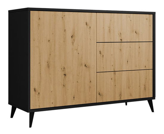 Komoda na nožičkách sa skvele hodí do obývačky, spálne aj predsiene. Model ponúka veľa úložného priestoru. Bez problémov sa do nej zmestí oblečenie, spodná bielizeň, hodinky, doklady a elektronické vybavenie. Pre vaše pohodlie je tu použitý systém otvárania „Push to open“. Na otvorenie alebo zatvorenie úložného priestoru stačí jemne zatlačiť na prednú časť nábytku.Izbová komoda dokonale ladí s klasickými, škandinávskymi a rustikálnymi kompozíciami. Kombinácia čiernej s odtieňom dubu prináša do interiéru teplú a útulnú atmosféru. má priestranný vrch. Môžete popustiť uzdu svojej fantázii a vytvoriť jedinečné aranžmány. Tento variant je dokonalým riešením pre ľudí, ktorí chcú vo svojom interiéri dokonalú organizáciu a útulnosť.