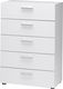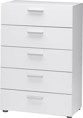 Jednoduchá komoda s piatimi zásuvkami sa vyznačuje moderným a čistým dizajnom. Preto je vhodná do moderne zariadených domácností a výborne sa bude hodiť do predsiení, obývacích izieb, spální alebo pracovní. Zásuvky komody majú širšie kovové úchyty a komoda stojí na drobných nožičkách.