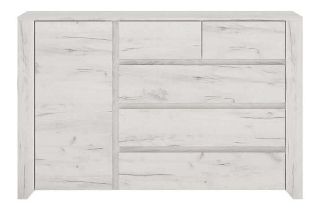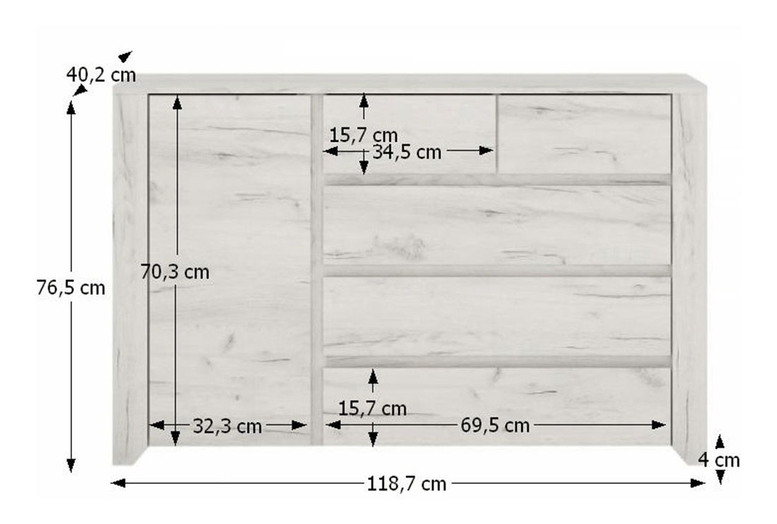Komoda Adamus Typ 41 1D5S je sektorový nábytok s dvierkami v ľavej časti a piatimi zásuvkami v pravej časti. Je vyrobená z laminovanej DTD a má moderný bezúchytový systém. Tento nábytok je ideálny pre zariadenie detských a študentských izieb. Výška komody je 118,7 cm a hĺbka 40,2 cm. Je vyrobená v príťažlivom univerzálnom farebnom prevedení bielej (korpus) a dvierok vo farbe craft. Komoda je dodávaná v demonte a má rozmery 56x40,2x116,3 cm. Výška spodného priestoru od podlahy je 2,5 cm a hrúbka materiálu je 16 mm.