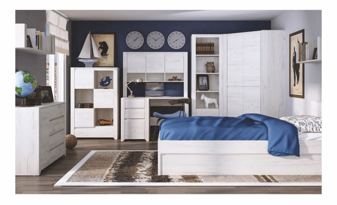 Svieži sektorový nábytok v príťažlivom univerzálnom farebnom prevedení bielej (korpus) a dvierok vo farbe craft. Nábytok je ideálny na zariadenie detských a študentských izieb, stavebný materiál je DTD laminovaná. Moderný bezúchytový systém.
