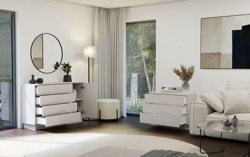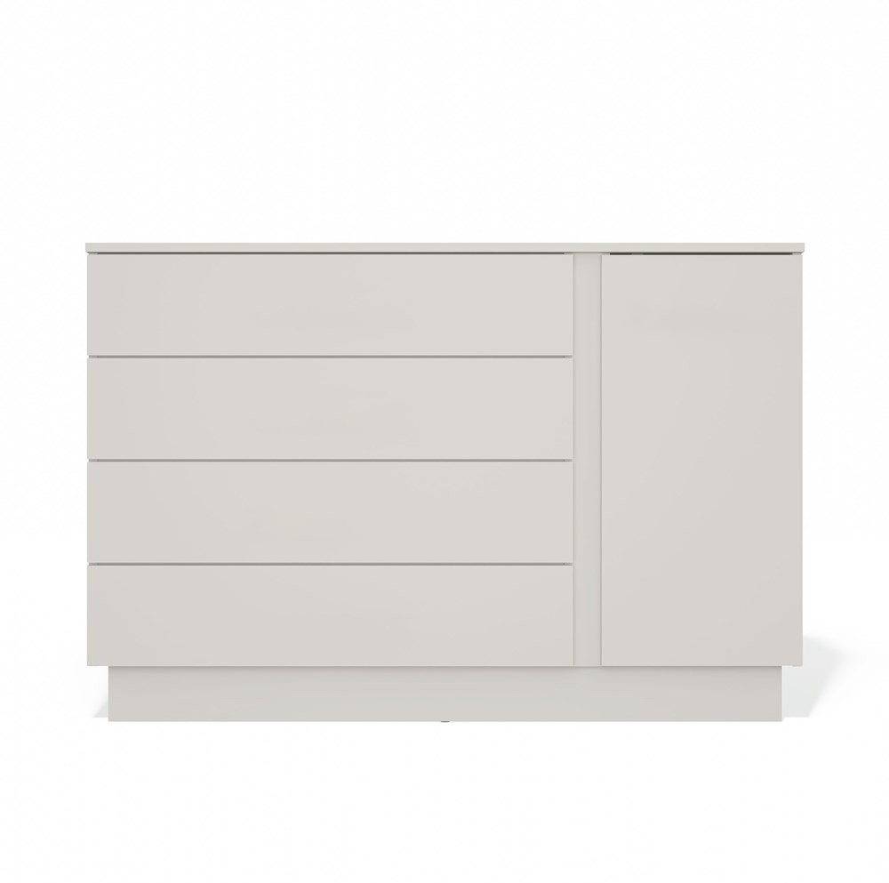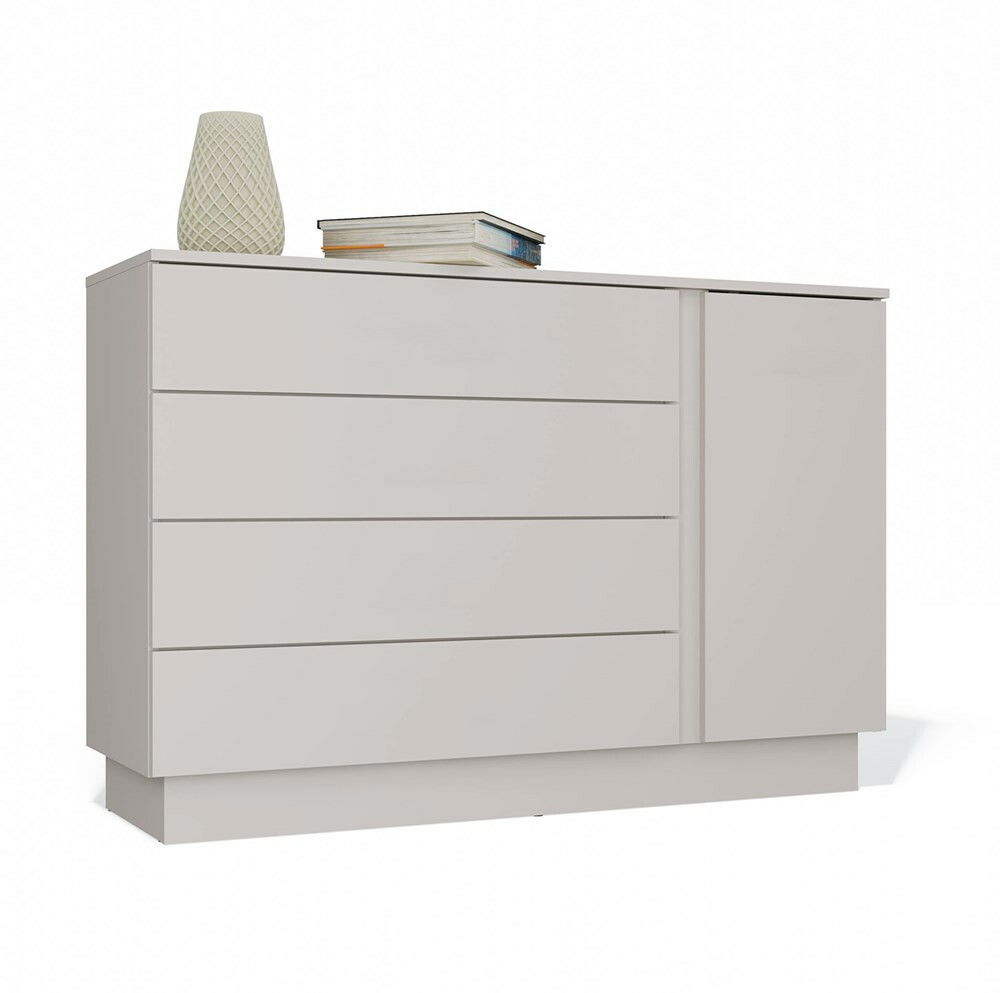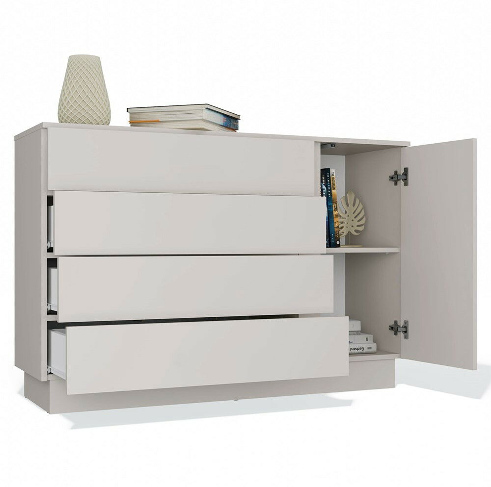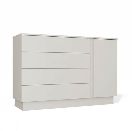 Komoda Ajuste 1 v elegantnej farbe kašmír je ideálnym riešením pre moderné interiéry, či už do obývacej izby, spálne alebo predsiene. S jej minimalistickým dizajnom a kompaktnými rozmermi sa bez problémov zmestí aj do menších priestorov. Tento praktický kus nábytku ponúka štyri priestranné zásuvky s pohodlným systémom otvárania na klik a jednu skrytú skrinku s poličkou, čo zabezpečuje dostatok miesta na uskladnenie rôznych predmetov. Jej kvalitná konštrukcia z laminovanej drevotriesky zaručuje dlhú životnosť a jednoduchú údržbu.