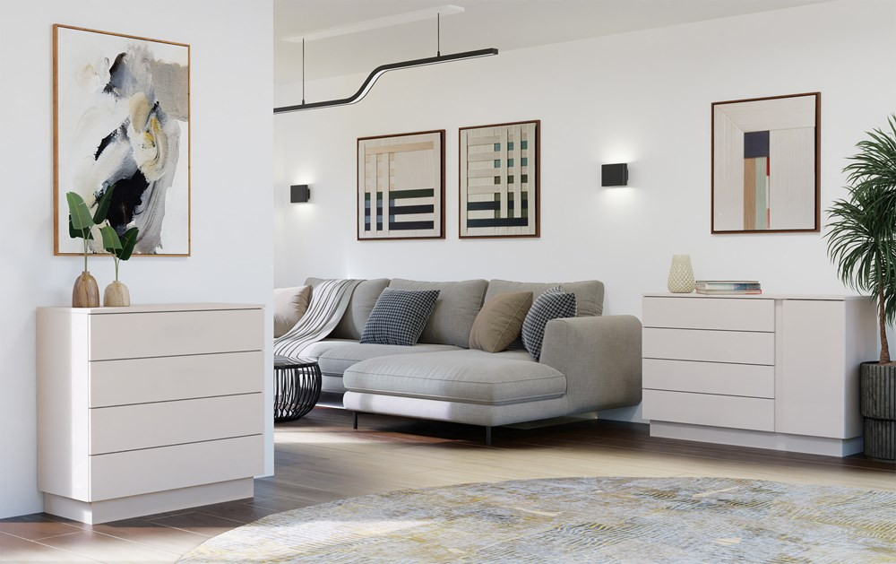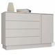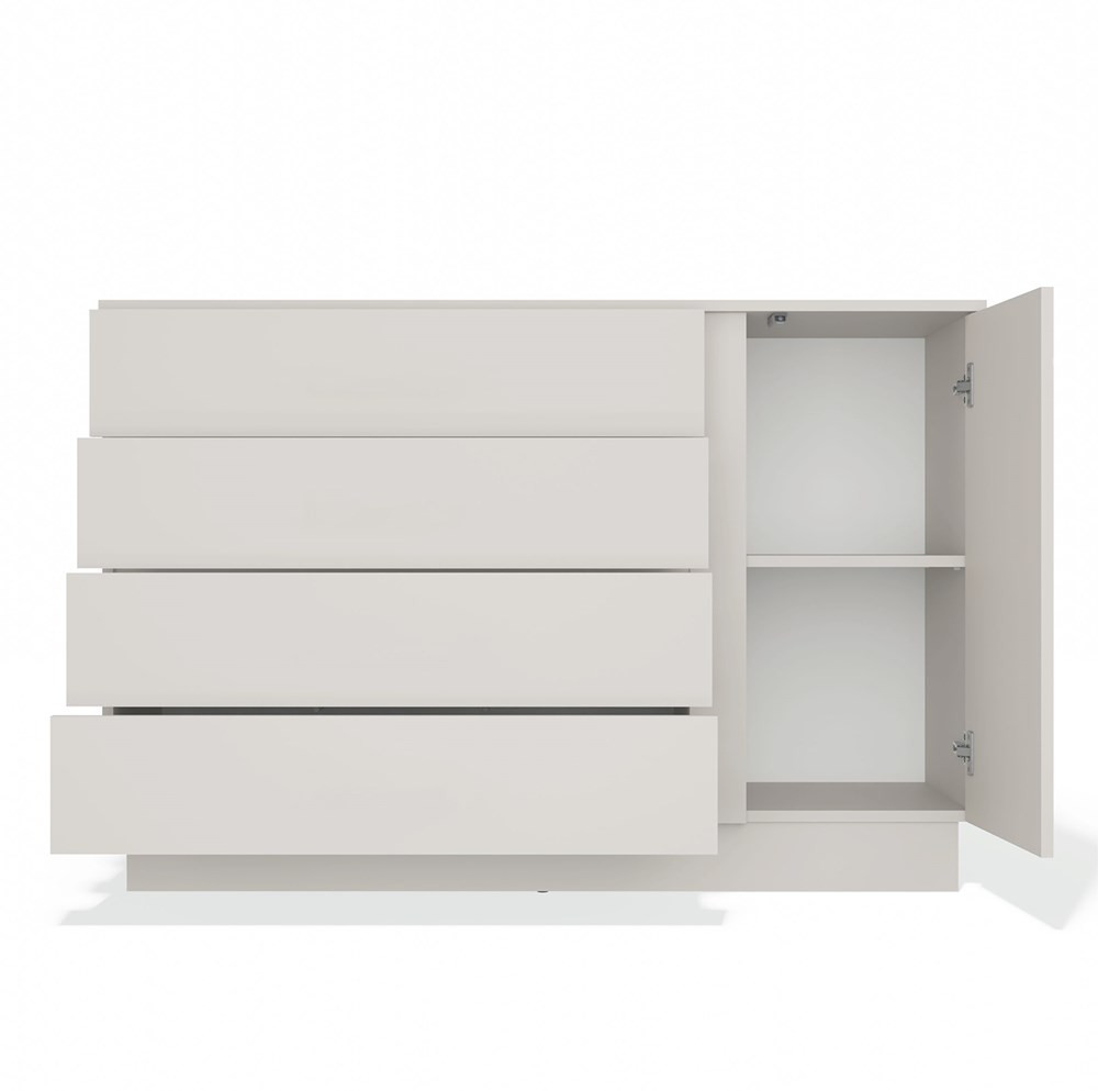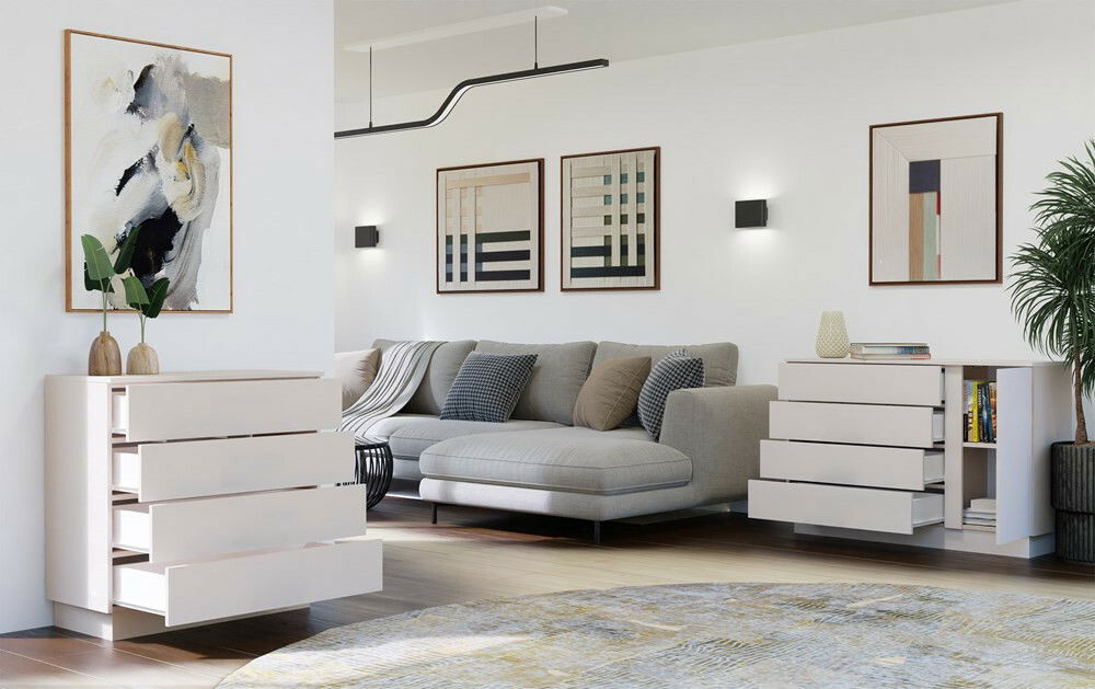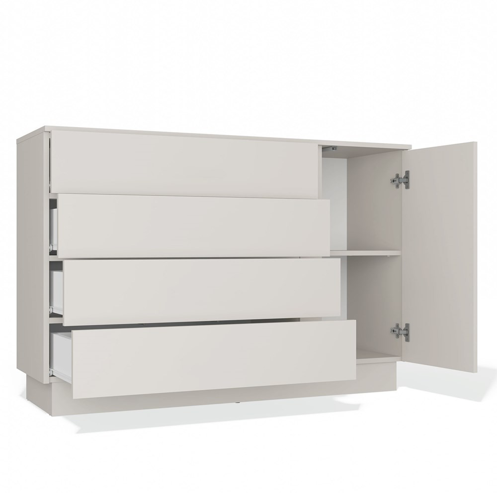 Komoda Ajuste 1 v elegantnej farbe kašmír je ideálnym riešením pre moderné interiéry, či už do obývacej izby, spálne alebo predsiene. S jej minimalistickým dizajnom a kompaktnými rozmermi sa bez problémov zmestí aj do menších priestorov. Tento praktický kus nábytku ponúka štyri priestranné zásuvky s pohodlným systémom otvárania na klik a jednu skrytú skrinku s poličkou, čo zabezpečuje dostatok miesta na uskladnenie rôznych predmetov. Jej kvalitná konštrukcia z laminovanej drevotriesky zaručuje dlhú životnosť a jednoduchú údržbu.