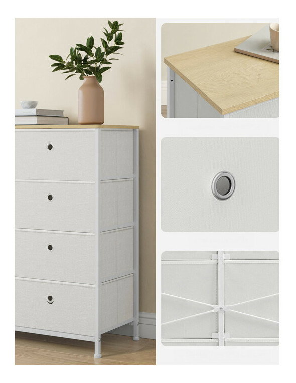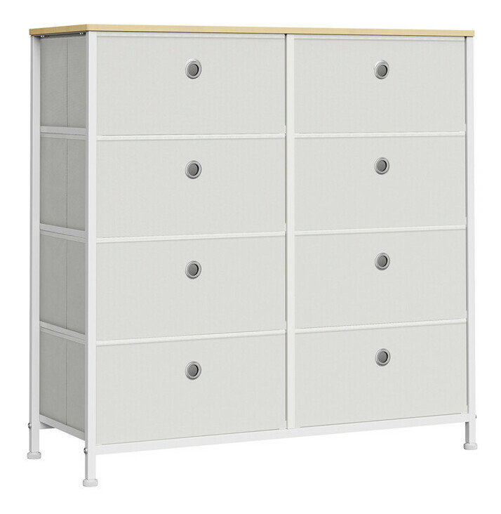 Komoda AUK-E1024 WT ponúka praktické riešenie úložného priestoru v modernom prevedení. Jej doska je vyrobená z MDF s matným dubovým dekorom, ktorý dodáva nábytku prírodný vzhľad a jednoduchú údržbu. Pevný kovový rám a nohy zabezpečujú stabilitu a dlhú životnosť, zatiaľ čo osem látkových zásuviek z netkanej textílie poskytuje ľahké a flexibilné úložisko pre rôzne drobnosti. Komoda má rozmery 80 × 30 × 82 cm, čo ju predurčuje na využitie v menších aj väčších priestoroch, kde je potrebné usporiadať veci prehľadne a efektívne.