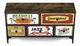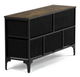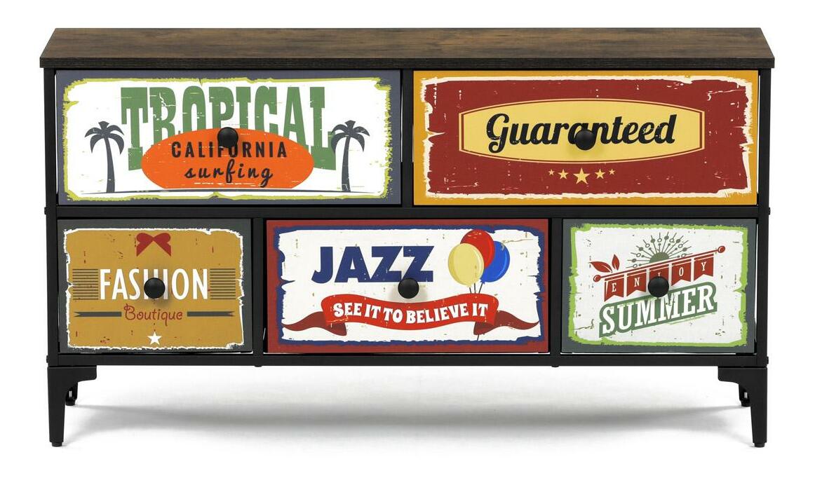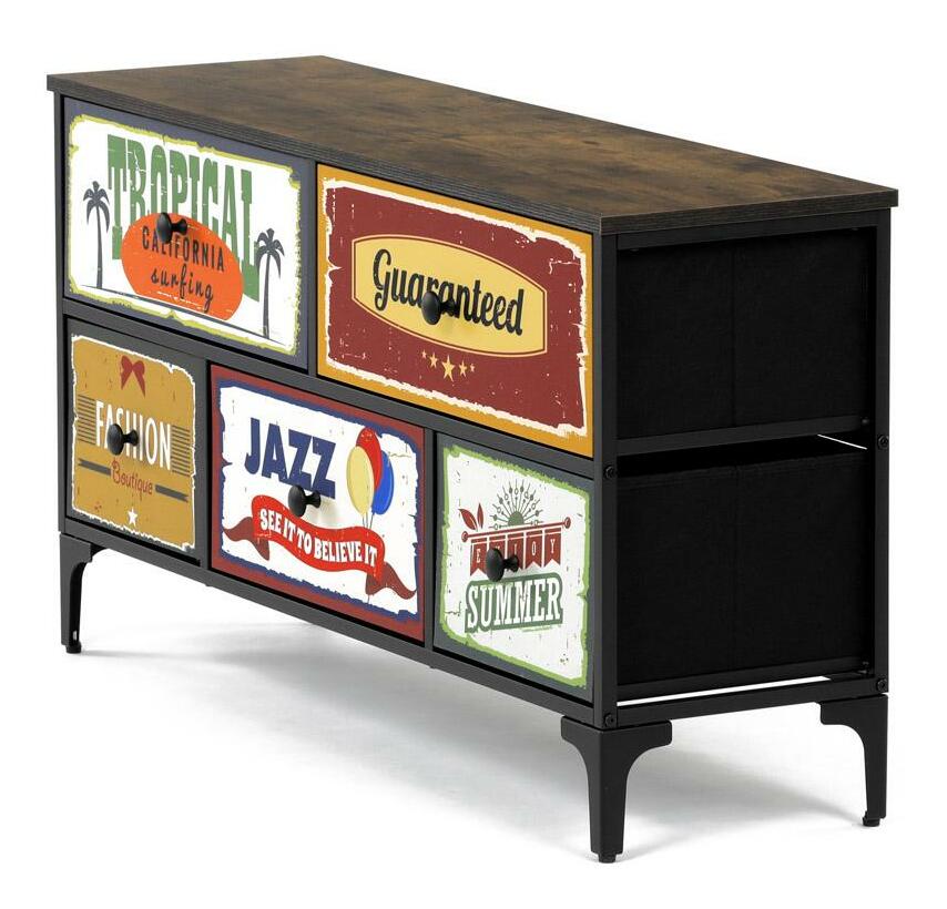 Retro komoda prinesie do vášho interiéru jedinečný štýl a originalitu. Textilné čelá zásuviek s výplňou HDF a vintage potlačou navodzujú atmosféru starých amerických barov a jazzových klubov. Kombinácia čiernej kovovej konštrukcie, dosky v dekore starého dreva a ozdobných nôh dodáva nábytku robustný, ale zároveň elegantný vzhľad. Korpus zásuviek je vyrobený z netkanej textílie s výplňou MDF, čo zaisťuje ich ľahkosť a jednoduchú manipuláciu. Ideálny doplnok do obývacej izby alebo štýlovej kaviarne, kde sa stane neprehliadnuteľným prvkom.